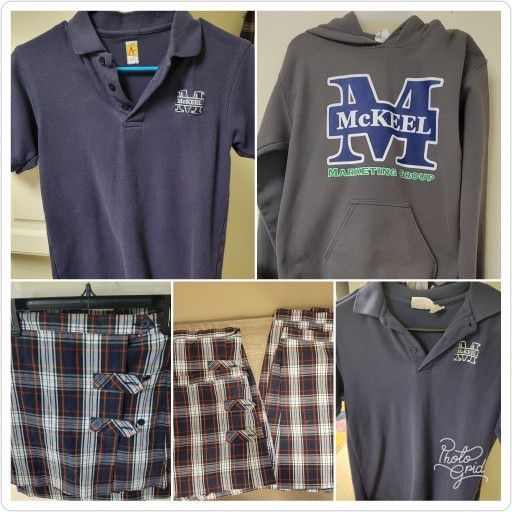 McKeel Academy jackets with hood Adult small $10 Skrits with shorts $5.00 each size Youth 14, 12, 10 1/2? Shirt size LG and Xlg youth $5 each. Jackets $10