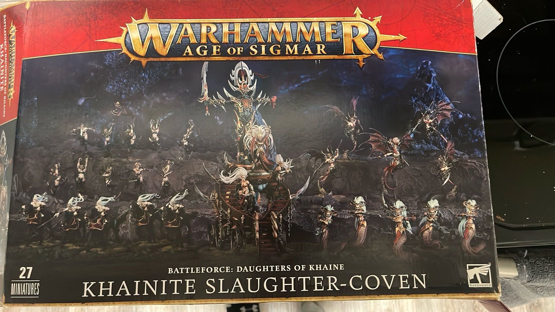1 box khainite shadowstalkers (in box) $30.00 1 box endless spells daughters of khaine (in box) $25.00 1 box Witch Elves (in box) $25.00 1 box morathi (in box) $75.00 1 box battle force Khainite Slaughter-coven (in box) $75.00 7 loose models (assembled) 1 Daughters of Khaine book