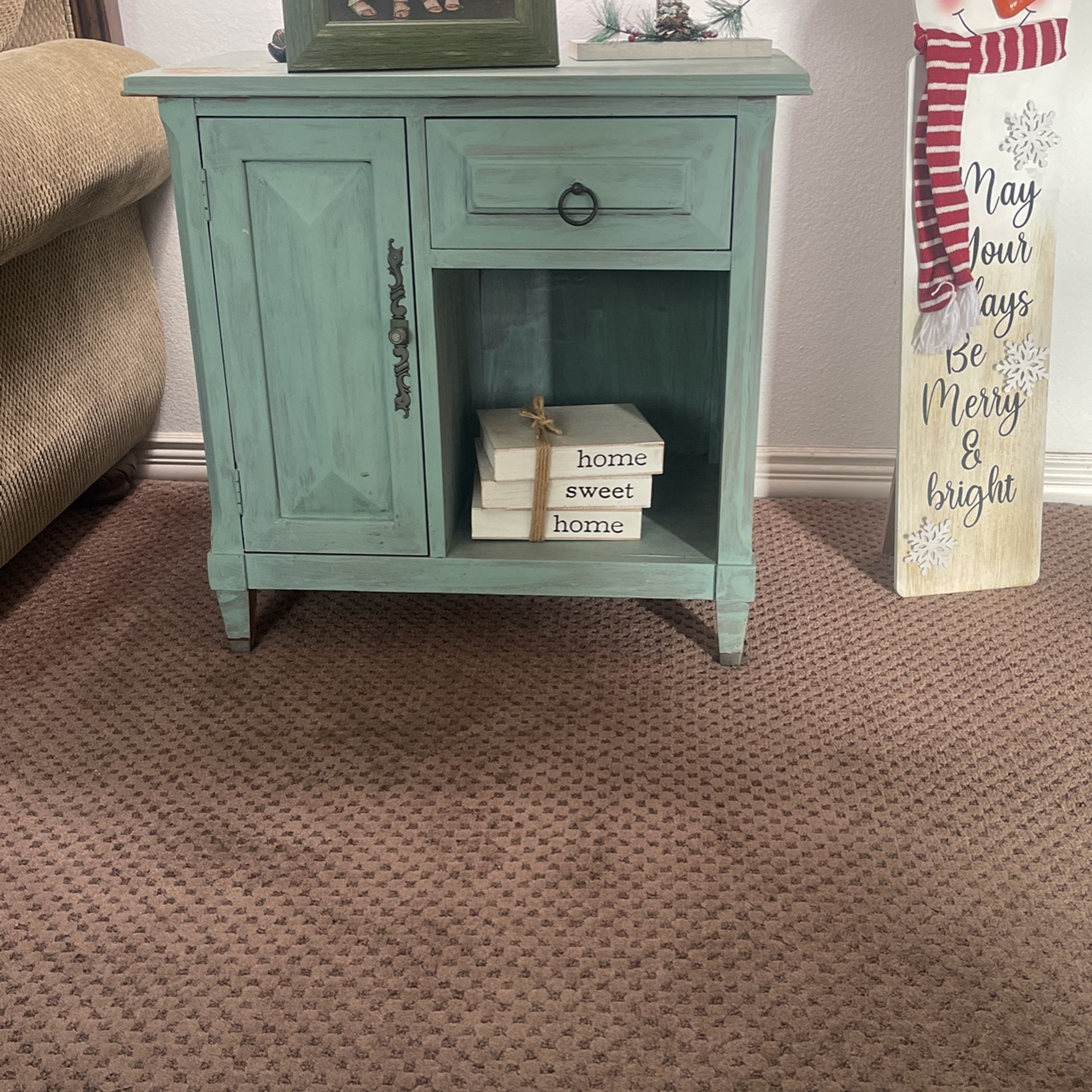 Solid rustic end table great condition $80 drawer’s open solid and heavy.