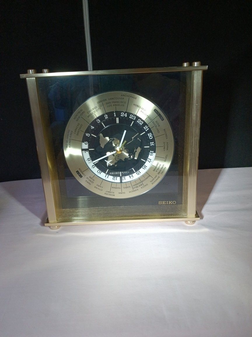 Satin brass finish, World Time Zone clock features airplane second hand. 8 1/2 inches square, 3+ inches deep, uses C battery (included). Perfect for traveler/executive/new graduate, makes an impression while beautiful and functional. Would add richness to any environment