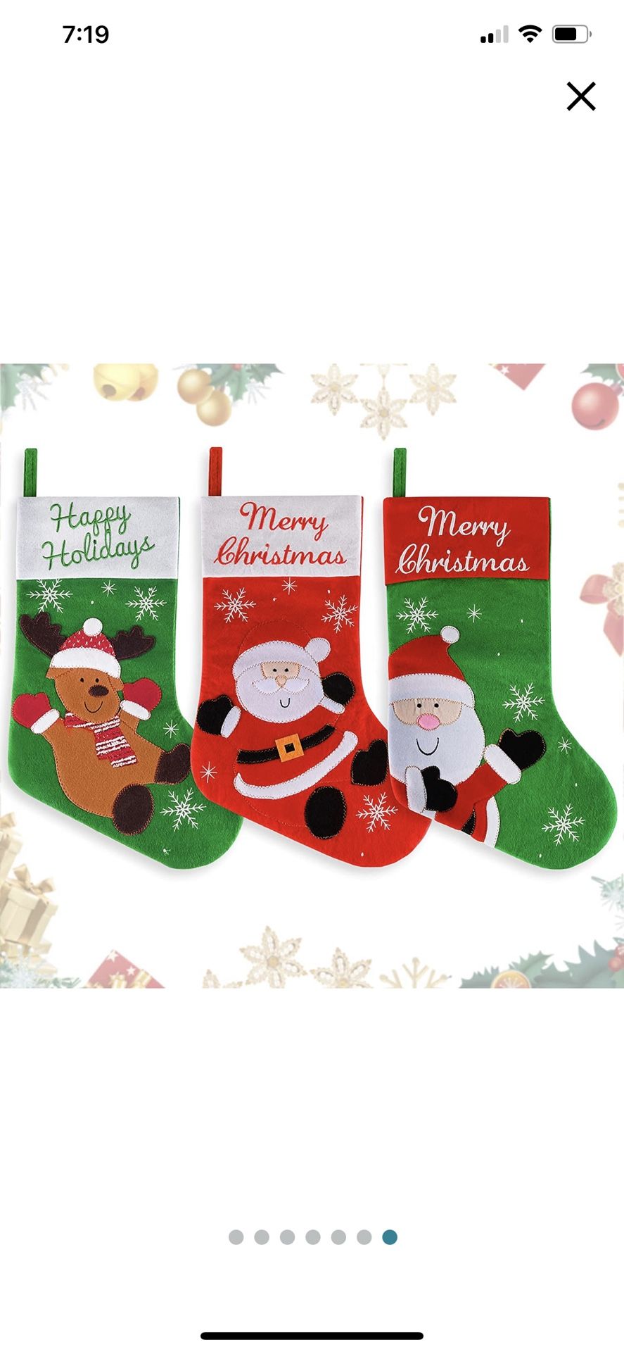 #32 About this item Durable and Eco-Friendly - Made of high-quality non-woven fabric, the Christmas socks are long-lasting and can be used for couples of years. Classic Delicate Design - Adorned with timeless holiday characters like Santa and reindeer, the holiday ornament decor use the traditional colors of red and green, which is never out of style and is the hit to all family members. Perfect Size For Holding Gifts - The holiday decor sock measures 10.2” length X 17.7” height and each weighs 58g, it has enough room to hold small, middle or large size gifts or other stocking stuffers you prepare for your families and kids. Package Contents - Includes 3 stocking socks, one adorned with green Santa, one with red Santa and one with reindeer.