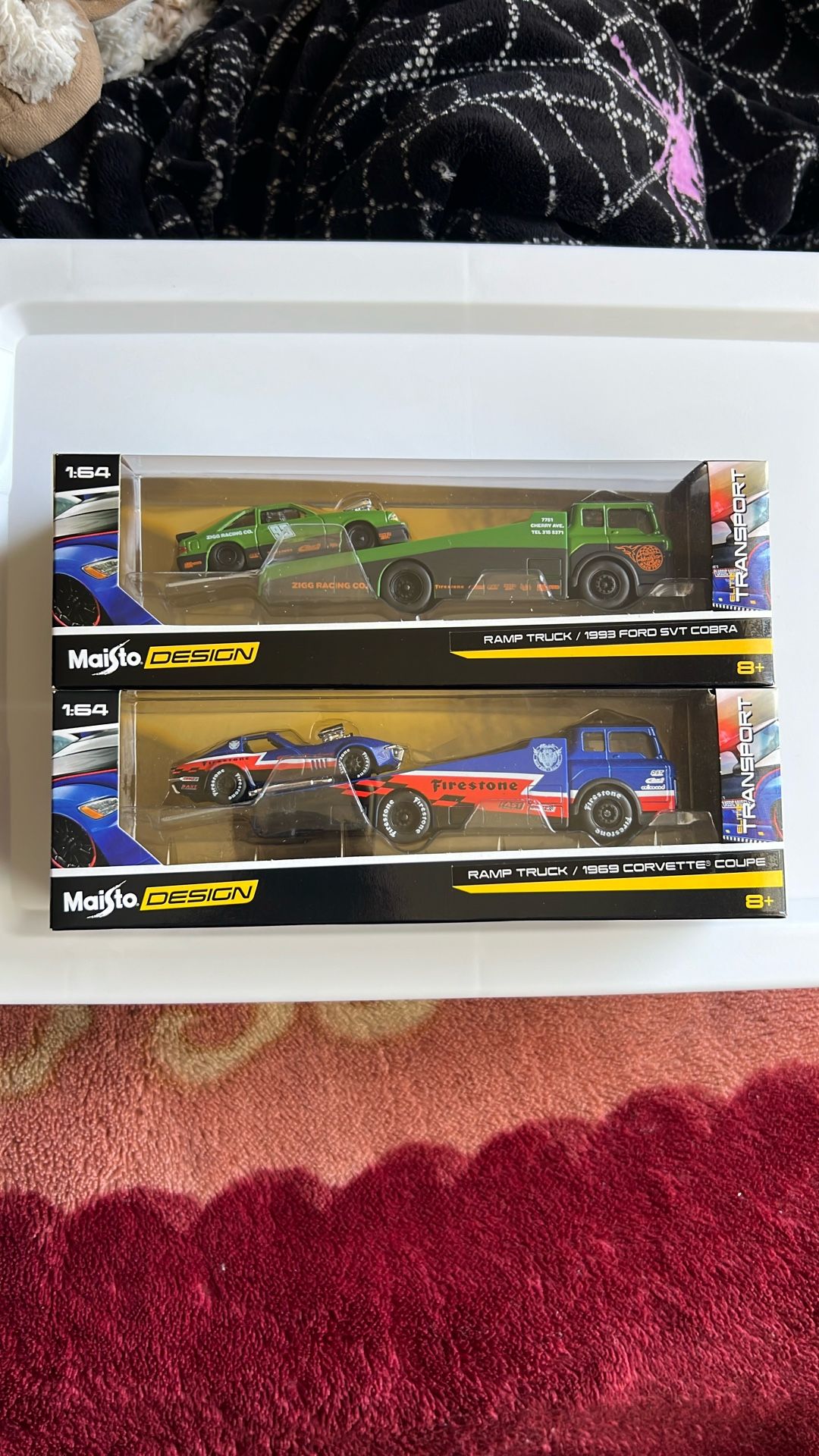 I am selling these 2 Maisto design Transport trucks with cars for $20 they are both new sealed in the box Ramp Truck / 1969 Corvette Coupe Ramp Truck / 1993 Ford SVT Cobra