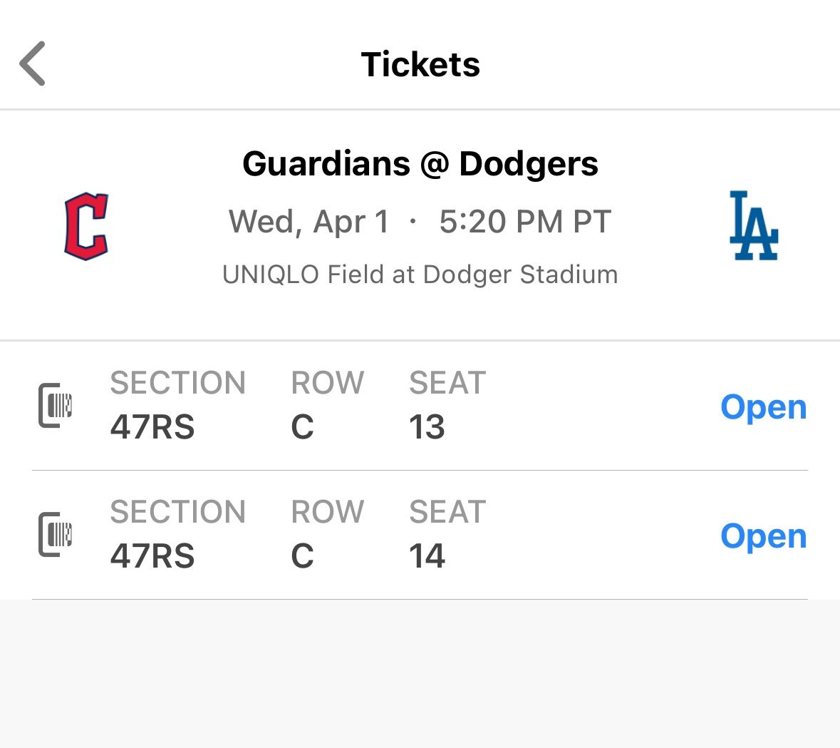 2 tickets to the Dodgers game on Wednesday, 4/1/26. Dodgers vs Guardians game 3. Section 47RS Row C Seats 13 & 14. $80 for both tickets! ($40 each) I have them in the MLB app and will forward them directly to you! I can accept Venmo or Zelle so you don’t even have to leave your house to pay.
