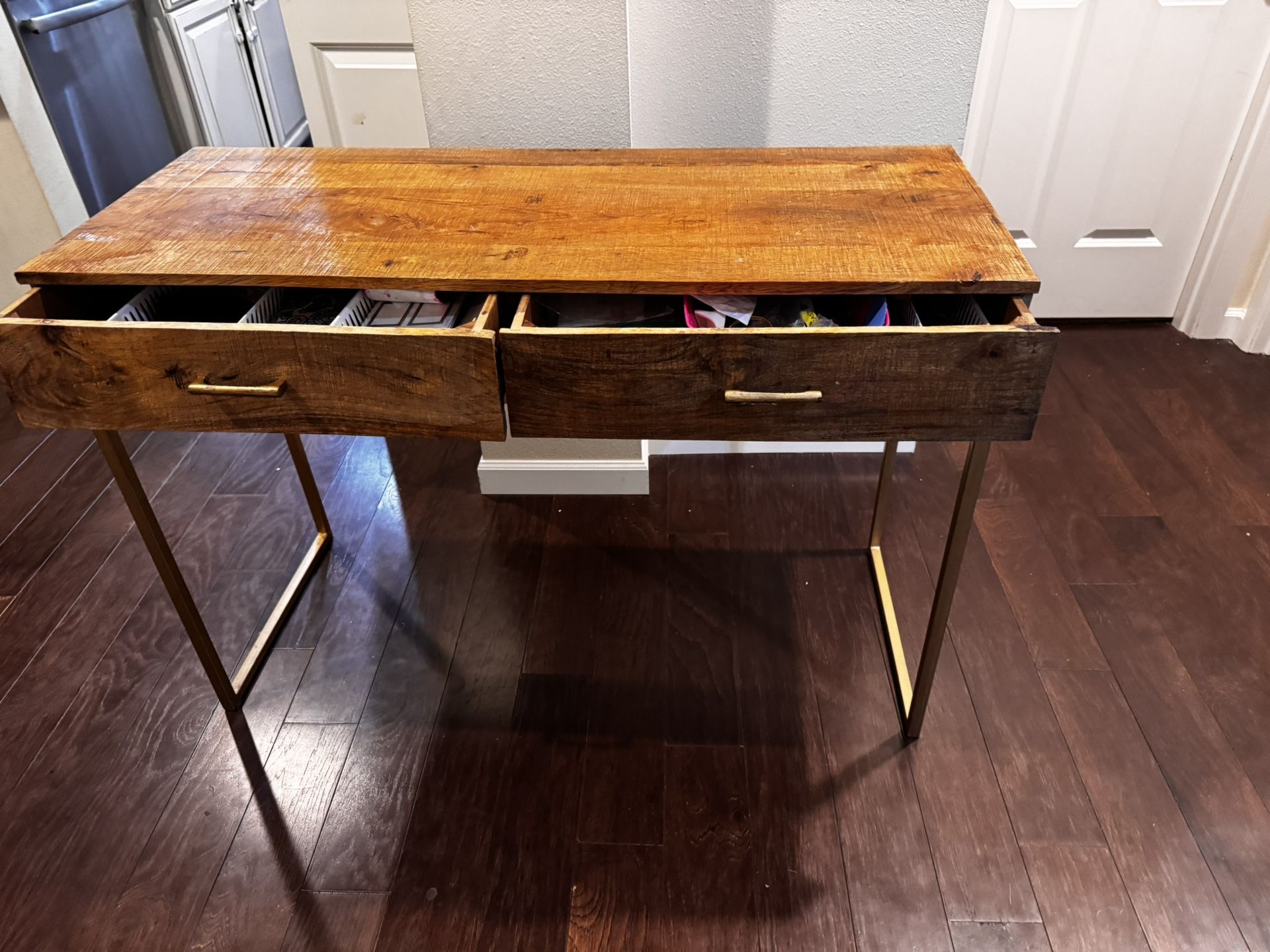 Style: Industrial Modern / Rustic Materials: Wood (Mango), Gold-Finished Metal Frame High-quality, solid wood desk featuring a distinct rustic grain and warm honey finish. Slim profile makes it ideal for use as a home office workstation or an entryway console table. Key Features: * Solid Construction: Thick, durable wood top with unique natural textures. * Storage: Two deep, smooth-sliding drawers with minimalist gold pulls. * Support: Slim-profile, gold-finished metal legs provide stability without visual bulk. Condition Details: The wood shows natural character and grain variation. The metal frame is sturdy and free of wobbles. Drawers are clean and fully functional. It’s been used but still in a very good condition. Note: Please bring a vehicle enough for transport; legs do not detach.