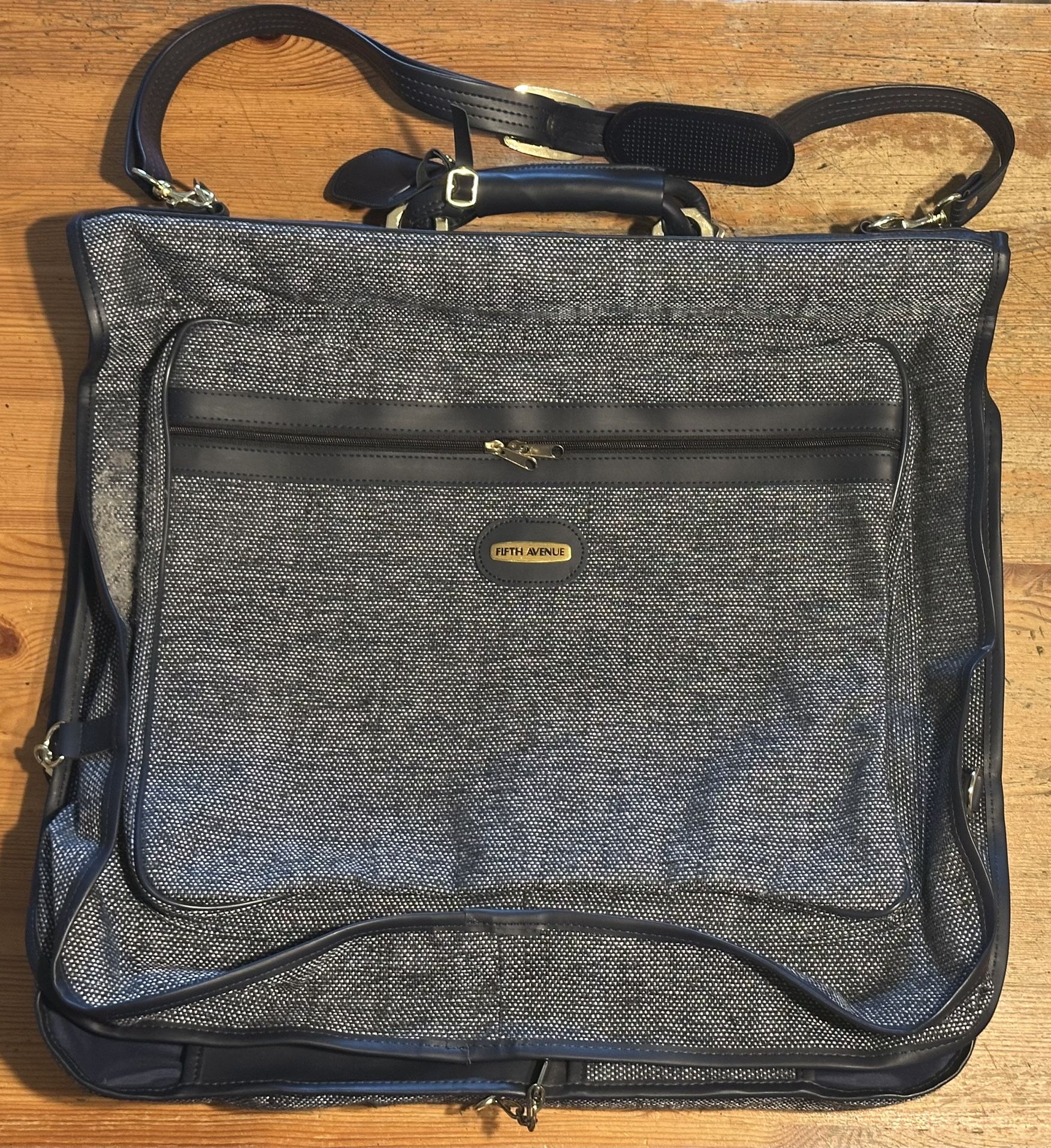 BRAND NEW, VINTAGE, SAKS FIFTH AVENUE GARMENT BAG BLUE / GREY TWILL TRIMMED WITH BLUE CLIPS ZIPS CAHS ONLY, NO OTHER FORMS OF PAYMENT