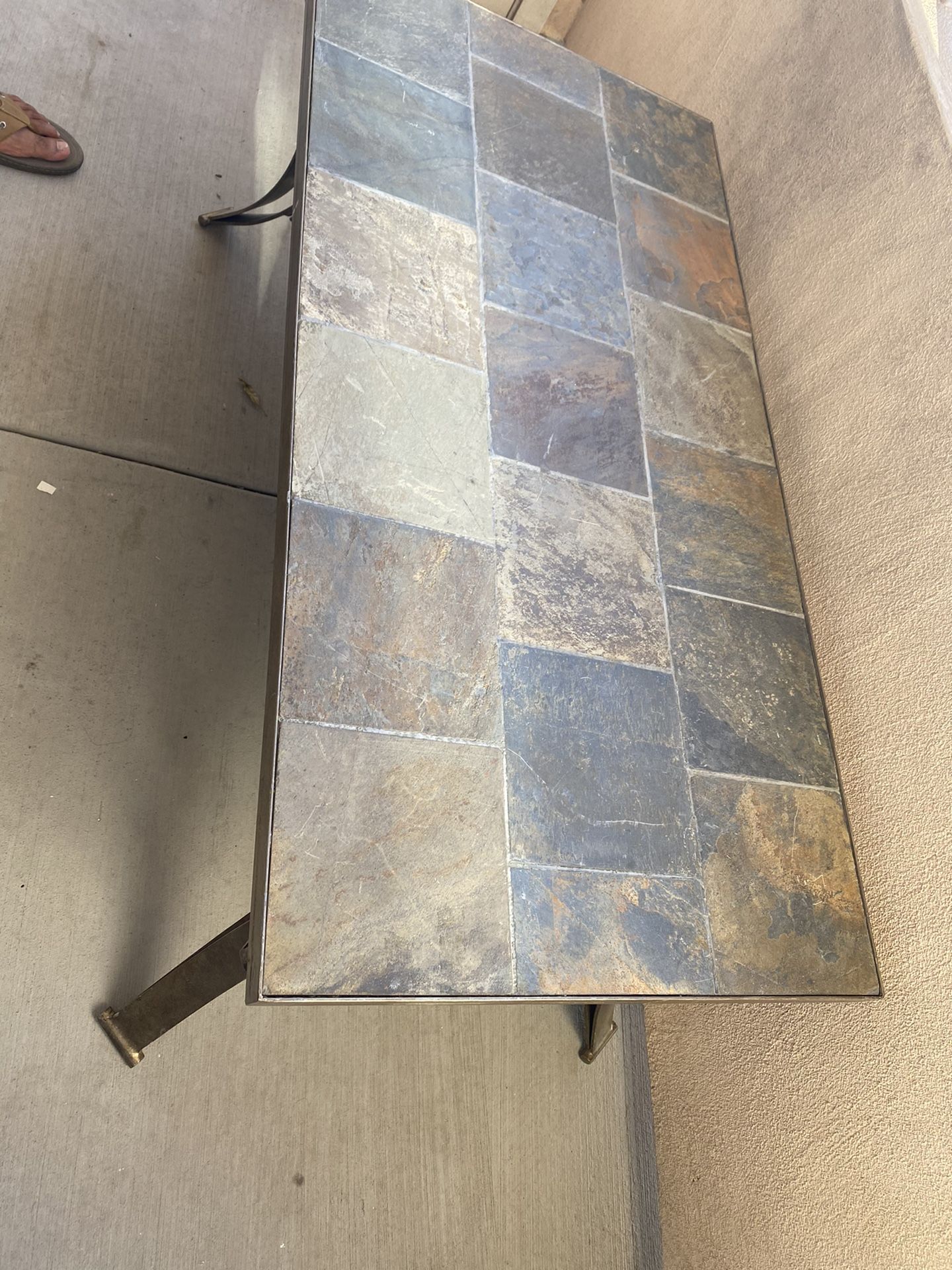 Coffee table, didn’t end up using it. Too big for our little living . Frame is metal, top is tile but don’t exactly what it’s made of but it’s very sturdy and heavy!