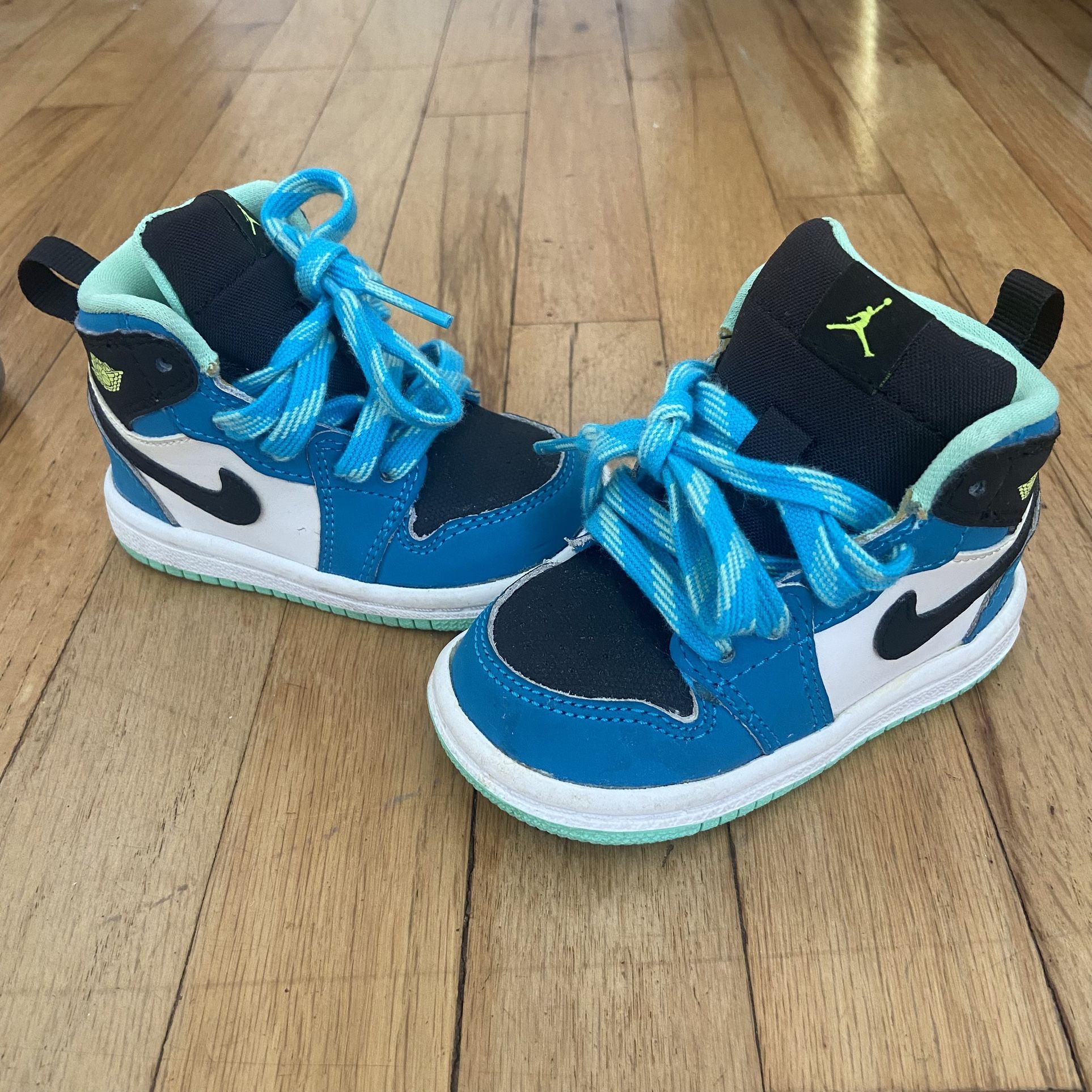 Air Jordan 1 mid-rise, size 4c in aqua blue. Shoes are hardly worn on bottom, maybe 2 times.