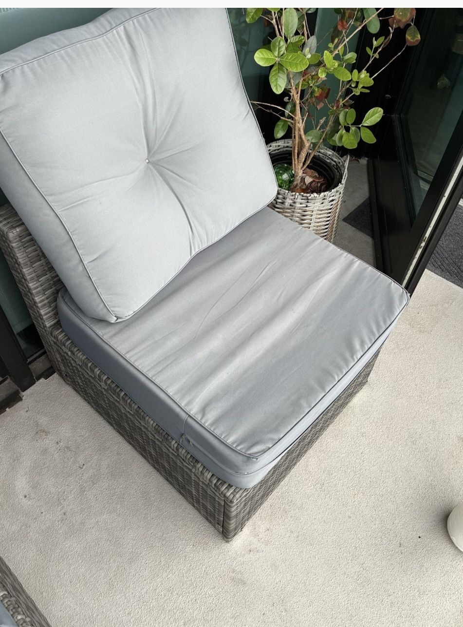 Matching woven patio chairs with cushions. Comfortable, neutral color, great for balcony or patio. Cushions were previously in the sun, so one side is lightly faded, while the reverse side is like new (can be flipped). • Sold as a set of two • Clean and well maintained • Professionally wrapped & stored • Ready for pickup
