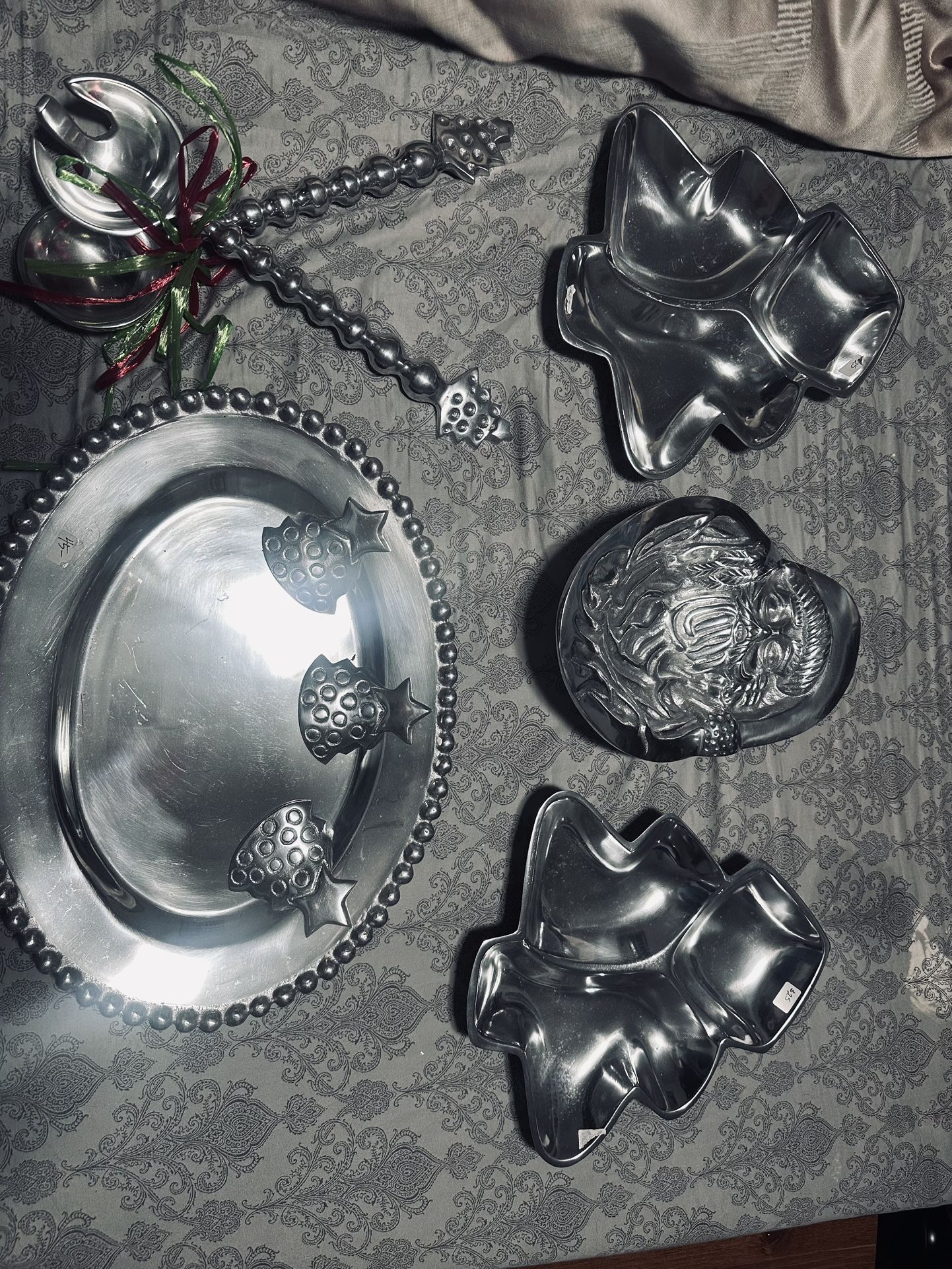 Collection of pewter Christmas pieces. 2 Christmas tree dishes 1 Serving platter with serving spoon and fork 1 candy dish to look like Santa’s face. Selling all pieces for $225, or willing to sell them individually. Will take offers.
