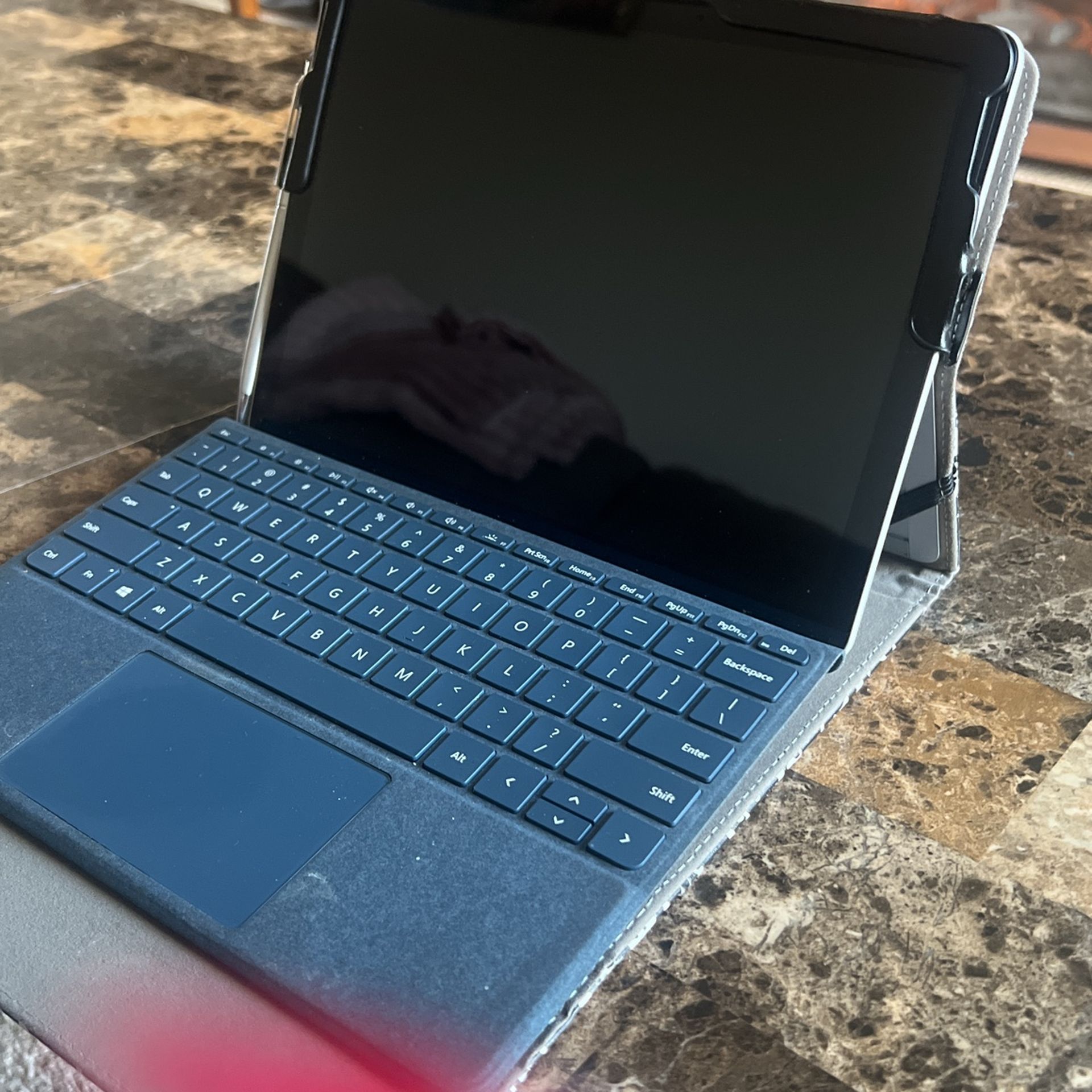Comes with charger. Surface mouse and detachable keyboard. Also has a notebook cover. Can be used as a laptop or tablet. Works great. Used for school work. Very well taken care of.