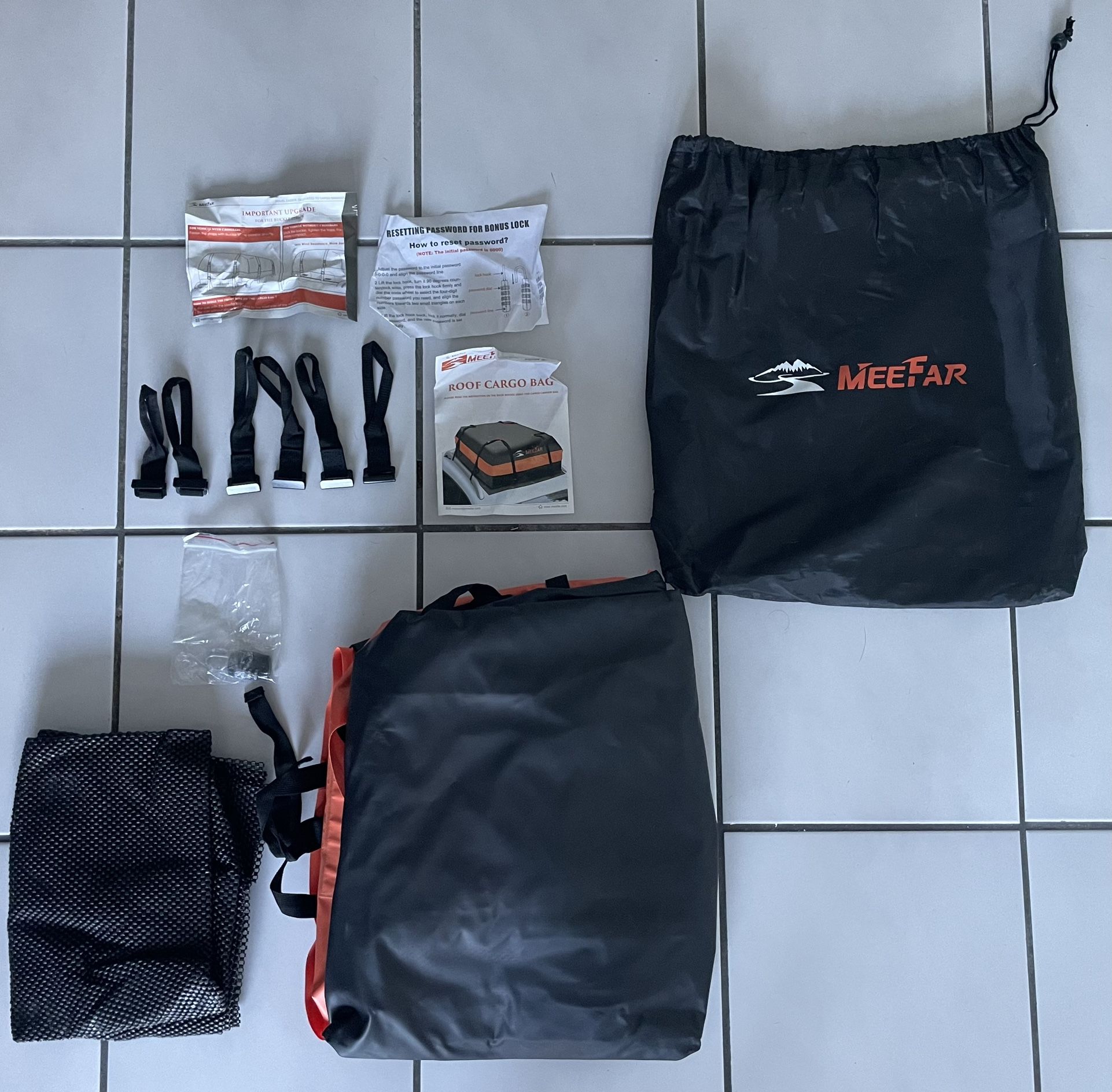 Selling this car cargo roof bag in perfect condition! 15 Cubic Feet Car Waterproof Roof Cargo Bag - New. Only used it once to move from Georgia to Florida and get a lot more cargo capacity on my Mazda 3. Very easy to install, very sturdy and completely waterproof. Priced to sell fast, this is a great deal!