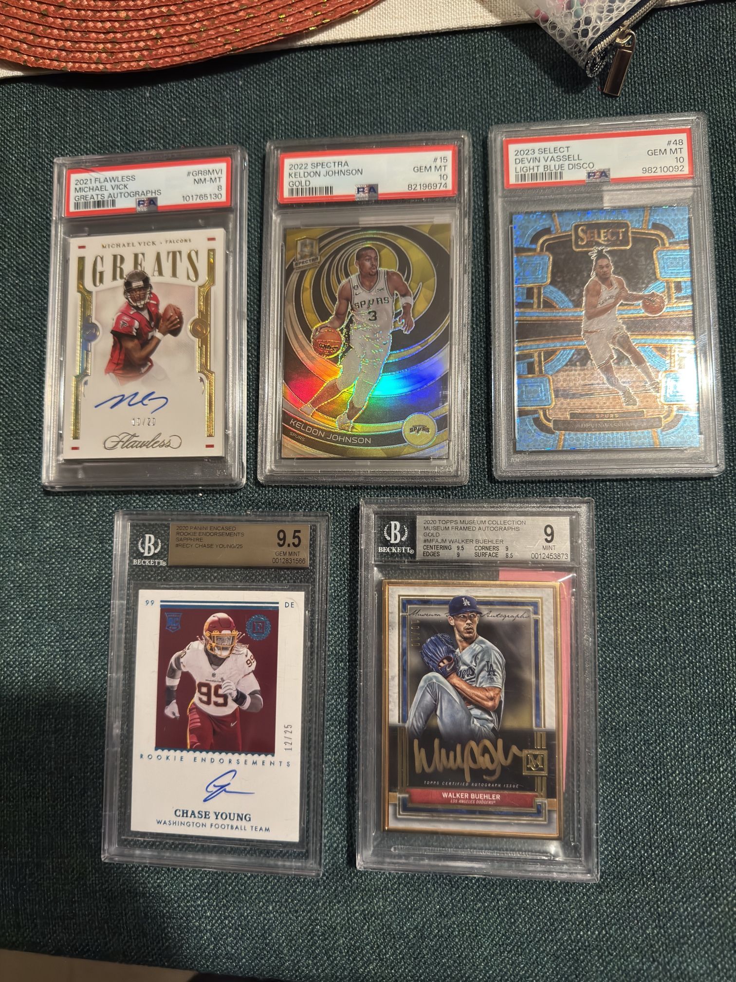 Raw Andre Ethier 14/39 - $30 Kevin Mchale 49/49 - $40 Cooper Flagg 26/85 - $190 Bryan Woo 05/17 - $100 Felix Hernandez 1/1 - $75 Jaylin Williams 08/25 - $30 Jeremy Sochan 03/10 - $175 Frank Viola 07/25 - $30 Slabs Walker Buehler 10/10 - $225 Chase Young 12/25 - $40 Michael Vick 10/20 - $275 (Crack on top left corner of slab) Keldon Johnson 09/10 - $70 Devin Vassell 73/99 - $70 Wiggle room on prices