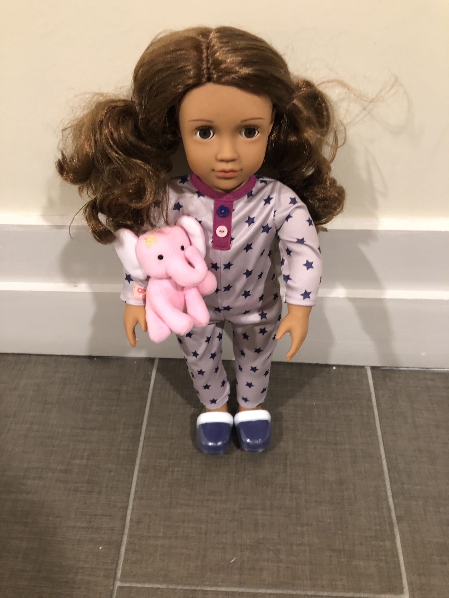 Highlights 18-inch slumber party doll Maria Long brown hair with brown eyes that open and close for sweet dreams Arms, legs, and neck rotate to help change outfits Includes: doll, onesie with decorative stars, undies, pink elephant stuffed animal, and slippers Easy-open closures make outfit quick to put on and remove Compatible with most 18-inch dolls and accessories See less