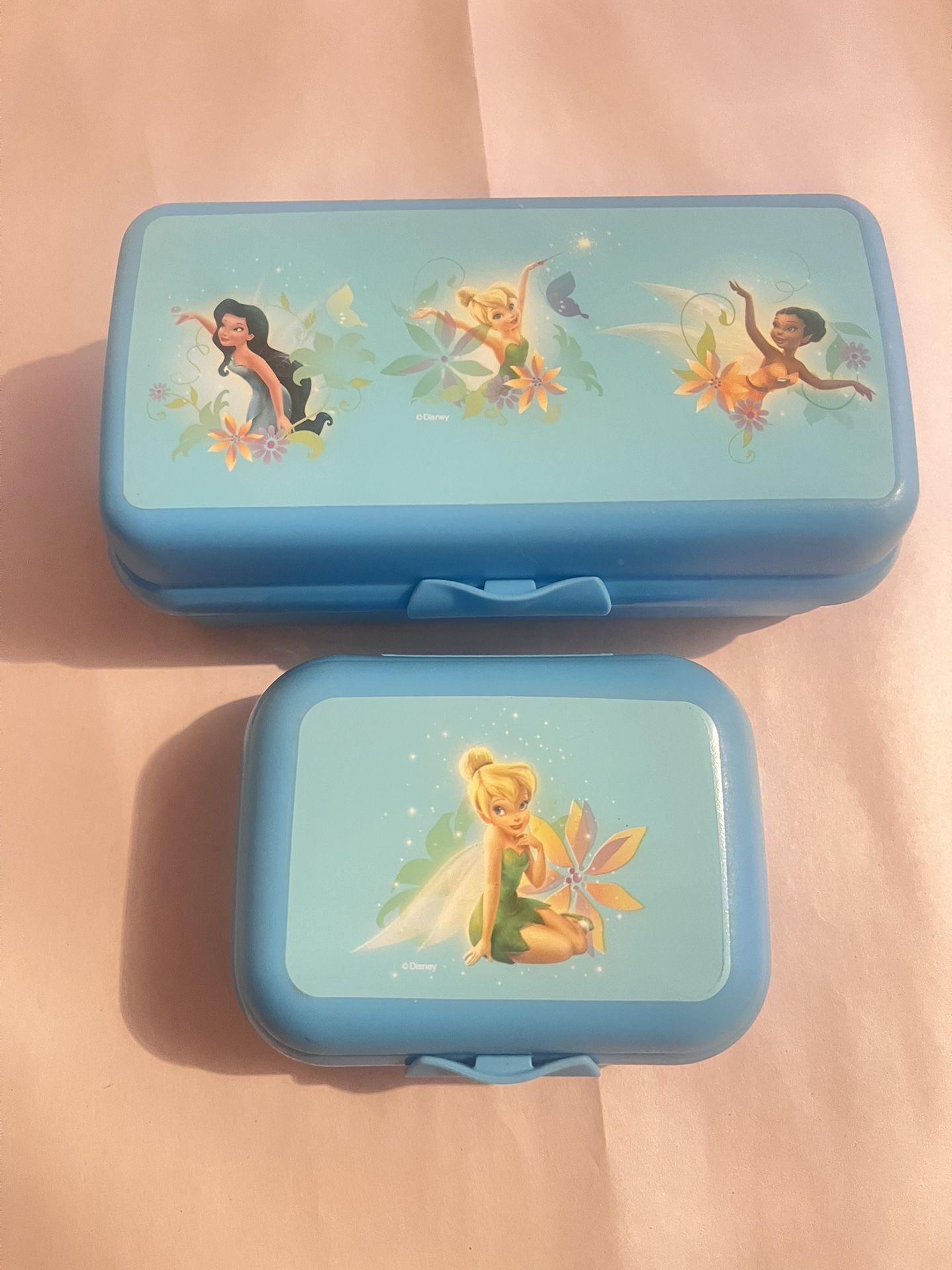 Tupperware BLUE Tinker Bell Lunch Set 2 Piece Taker Set - large keeper is 7.5”x3.5” small keeper is 4.5”x3.5” Will do bundle deals with other Tupperware items listed, just send me a message! Please refer to photos for condition and reach out with any questions!