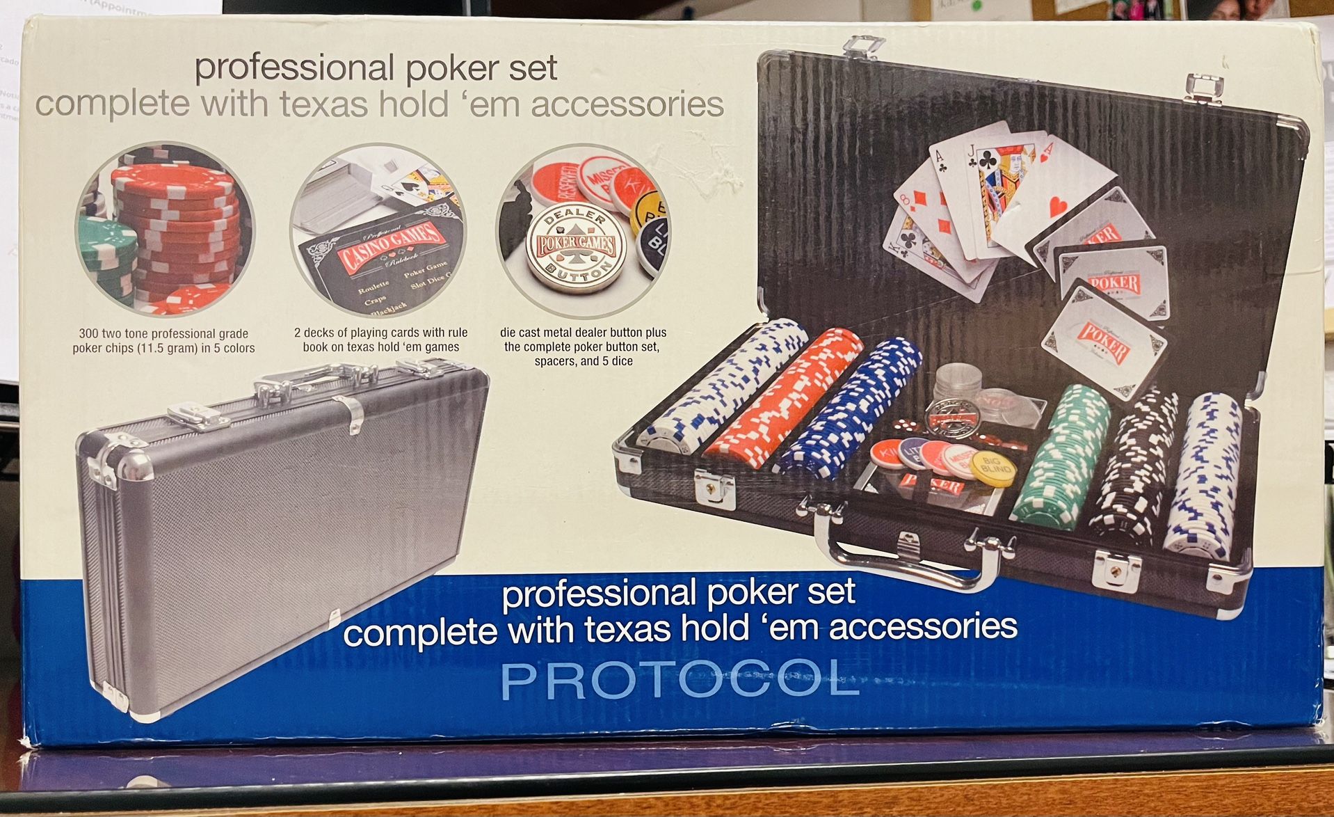 Protocol….Professional poker set, with Texas hold ‘em accessories. This set is new, never been used. Brand new price is $89.