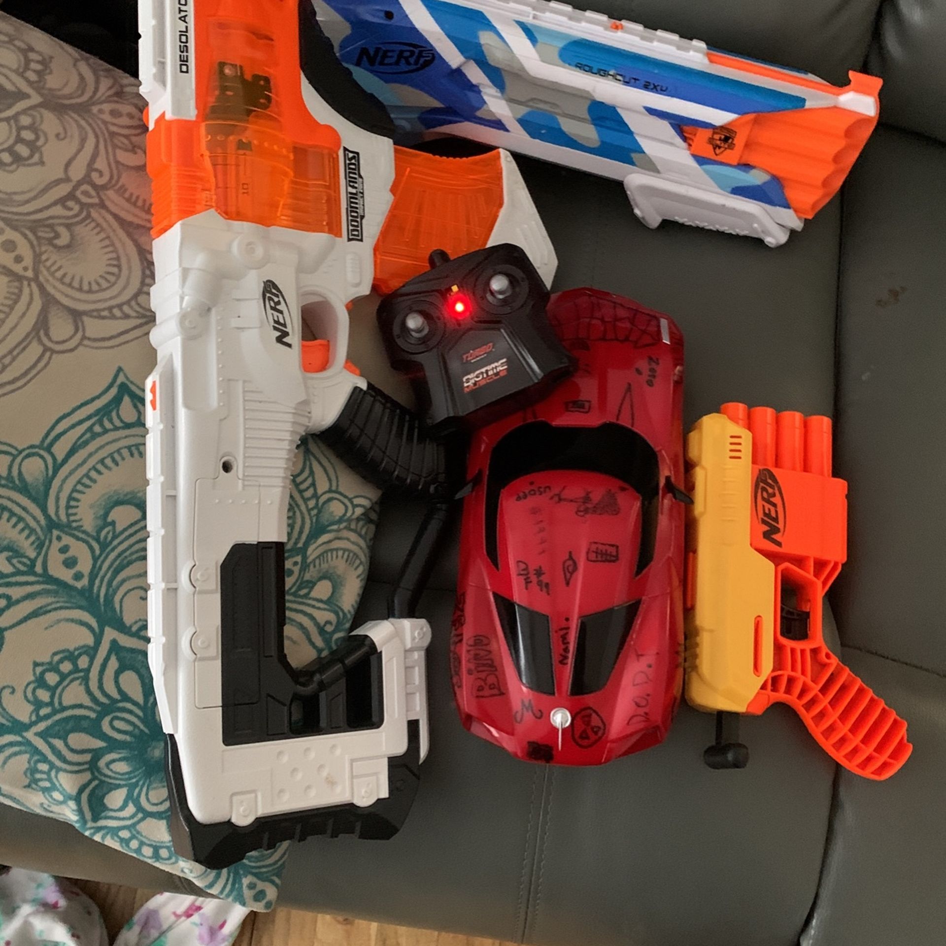 Red rc car in good condition has Ben drawn on but still works perfectly all the nerf gun work must be picked up buy everything sold together is 10$ and will come with a free baby walker if picked up