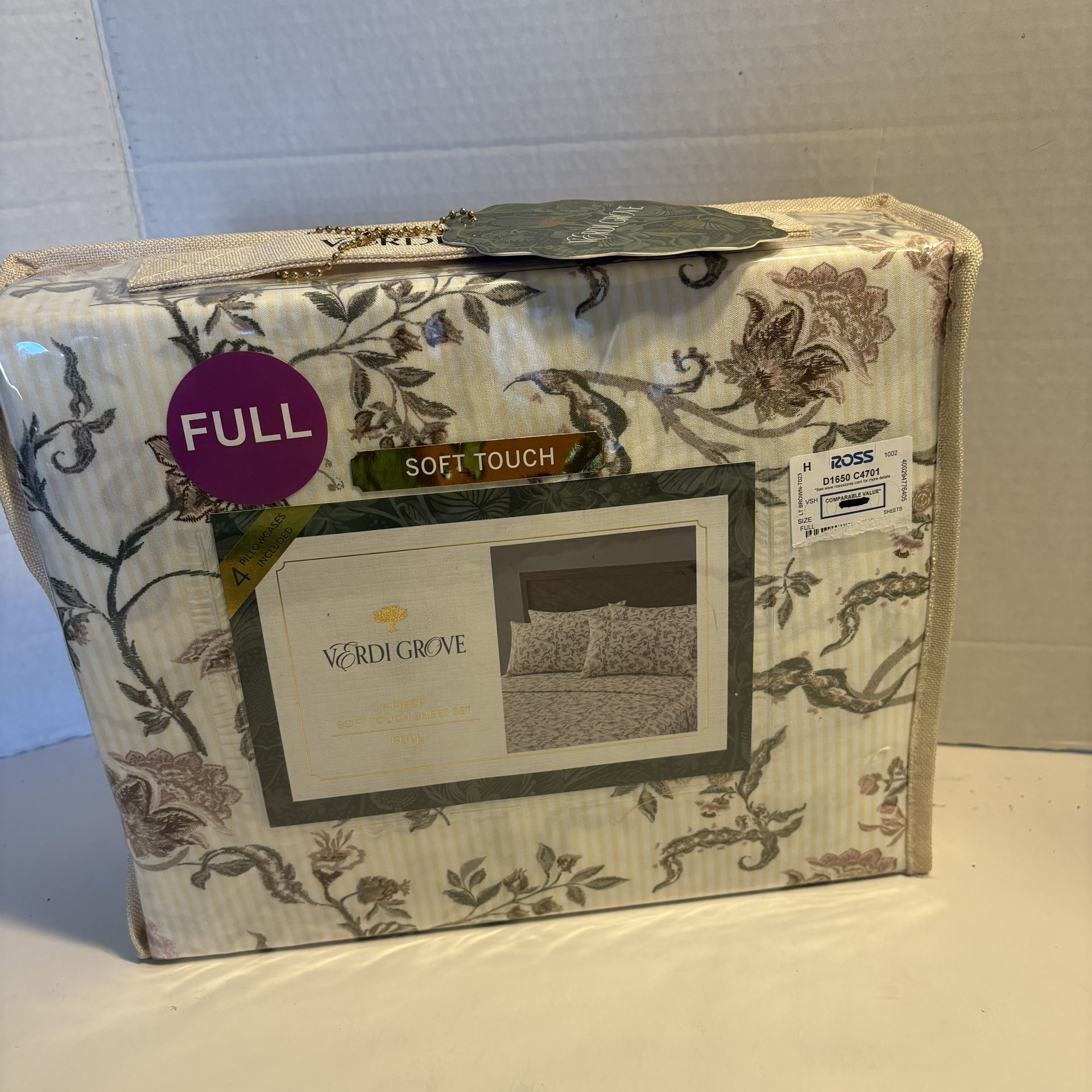 Verdi Grove 6-Piece Soft Touch Sheet Set in a "Full" size. The set features a vintage-inspired floral pattern with sage green and natural tones on a subtly striped background. Product Details Brand: Verdi Grove Size: Full Pattern: Floral / Botanical with subtle stripes Contents: The 6-piece set typically includes: 1 Flat Sheet (81in×96in81in×96in) 1 Fitted Sheet (54in×75in54in×75in, fits mattresses up to 14 inches deep) 4 Pillowcases (20in×30in20in×30in) Please check out my other listings by tapping on my profile