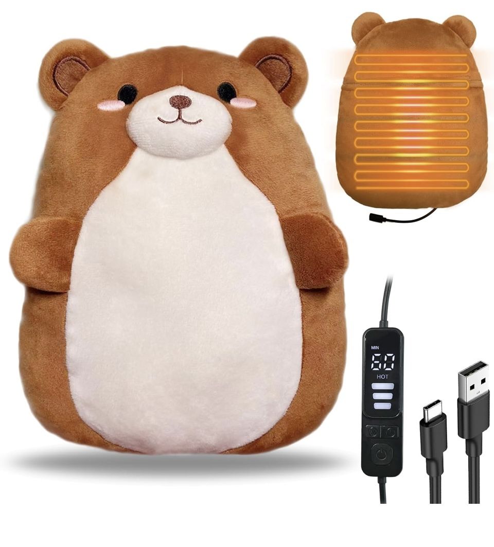 RELIEVE GENERAL BODY PAIN: This 10.3"(26CM) x 8"(20.5CM) cute bear heating pad provides targeted heat therapy for sustainable heating, enhancing comfort, helping to temporarily relieve the pain of menstrual cramps, and helping to relieve muscle tension in the back, shoulders, abdomen, and legs. AUTOMATIC DESIGN & EASY TO USE: The heating pad uses 5V/2A with Typc's plug. This cute bear heating pad has 3 heating settings, low setting: 138.2℉/59℃, medium setting: 152.6℉/67℃, high setting: 170.6℉/77℃; 4 timer settings: 15min/30min/45min/60min, which can be turned off automatically to ensure your safety. You can set the temperature and duration according to your needs. If you want to use it again, please turn it on again. NTC SENSING TEMPERATURE CONTROL DESIGN: Controlled by NTC sensors and protected by temperature control, the animal bear heating pad can work continuously and safely. So you can customise the heating intensity and duration according to your needs. Cable length: 78.7"(2 m), perfect for a warm cuddle on the sofa. It is not recommended to use the heating pad directly on the skin. WASHABLE AND HYGIENIC: Our animal bear fabric is soft, removable pillowcase can be washed and keep bacteria out. PERFECT GIFT CHOICE: The heated plush play is loved by everyone, especially its cute appearance and soft material. It makes a lovely gift for birthday, Valentine's Day, Mother's Day, Christmas and New Year.Ships within 24 hours.SKU 32 d white mailer