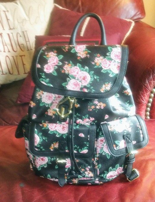 Black, Pink And Green Rose Printed Backpack With 4 Different Storage Pockets. Excellent Condition.