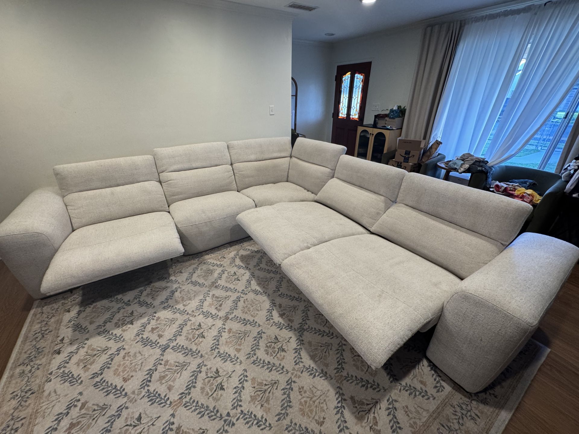 Living Spaces Morro Bay II Sectional Reclining Couch. Color:Oatmeal. 6 seats with 3 reclining seats. Measurements: Length both ways 131”, width 44”. Great and comfortable couch. *does have piling from the fabric from everyday use. All motors work and are in great condition. Shipping not available. Pick up only.