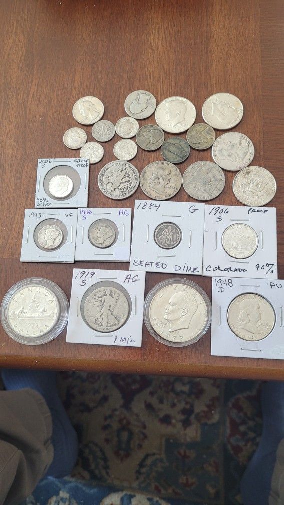 AU 1959 CANADA SILVER DOLLAR UNC 1973SEISENHOWER SILVER DOLLAR AU 1948D FRANKLIN AG 1919S WALKING LIBERTY 1 MILLION MINTED. 7 HALVES 2 ARE 40% 3QUARTERS 1 IS 2006S COLORADO PROOF 9 DIMES 12006S PROOF 1 1884 SEATED3 SILVER NICKLES NOT TO BE BROKEN UP NO TRADES NO SHIPPING LOCAL SALE SE. MASS FAIRLY PRICED