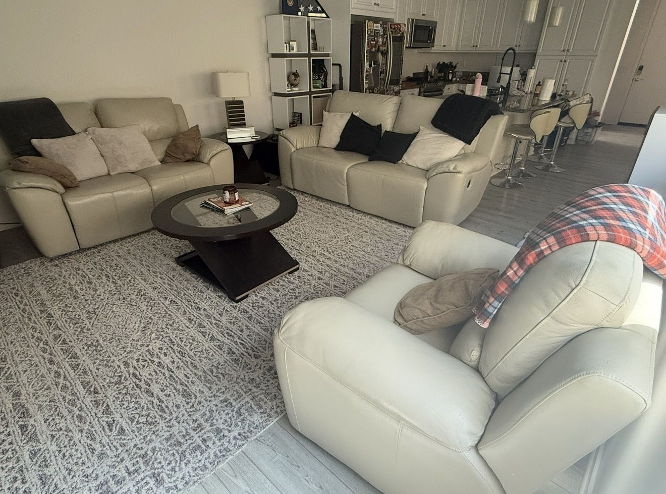 Power reclining sofa set - sofa, loveseat, and chair for $700 - Owned for about 5 years - Brand: Ashley Furniture - Material: Leather - Color: Cream - Condition: All in good condition. Chair and sofa in excellent condition, loveseat has some minor visible wear and tear. Dimensions (in; LxWxH): Sofa: 83x42x41 Loveseat: 70x37x41 Chair:46x37x41 Pick up only! 92656
