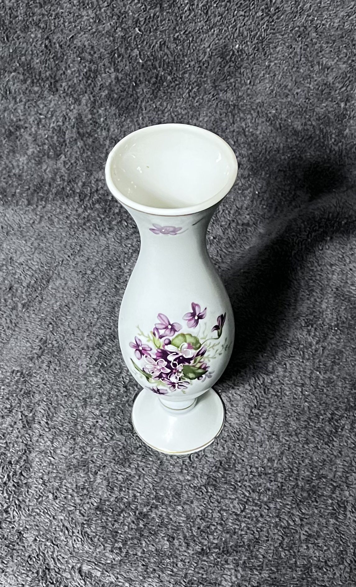 Beautiful Vintage Hand Painted Violets Porcelain Footed Bud Vase. This is a very pretty vintage hand painted vase. The vase is white with a very faint blue tinge. It is very difficult to show this tinge on the photos. It is most apparent just above the base. It features handpainted purple violets on both the front and back and has gold trim. It is a very good quality porcelain and is painted beautifully. It displays beautifully with some small flowers or by itself. Height 8 in Depth 6.75 Diameter (Mouth) 2.5 in Diameter (Base) 2.25 in Weight 1 lbs 8 oz In very good vintage condition. There are no chips, cracks, or crazing. Please review the photos for verification of condition. Photos are considered part of the description. From a NON-SMOKING home. Item #344