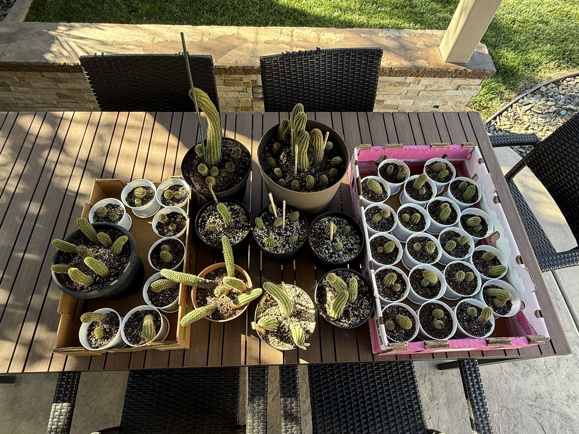 Young and mature cactus for sell. Prices start at 3 and up. Pick up only. Photo of cactus shown with pink flowers is when they bloom in the spring and summer.