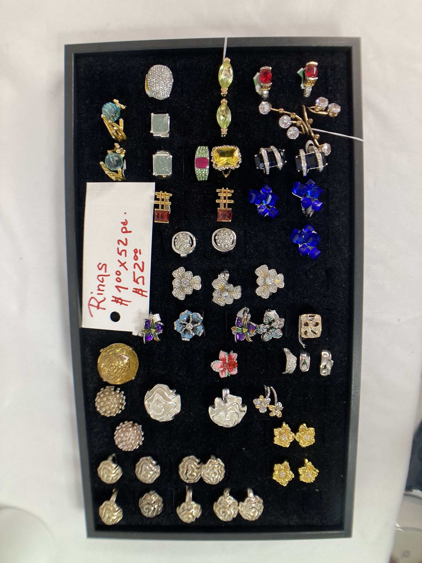 52 beautiful cocktail Rings All rings are new from my boutique. I am retiring . As you can see by the photos, we have a variety of Ruby, citron, sapphire, enamel, beautiful, en enamel flowers, a great opportunity. I have a lot more jewelry if you interested.