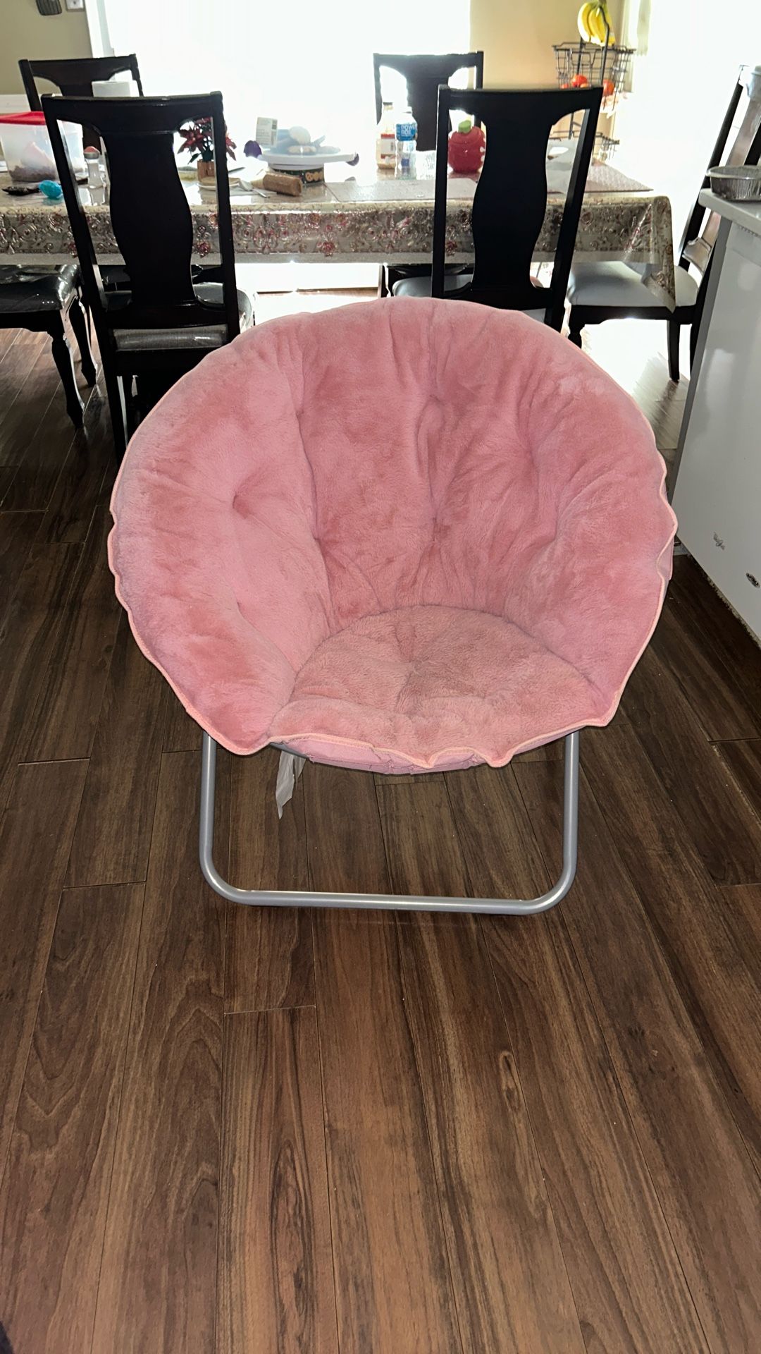 Comfortable pink saucer chair in good condition. Soft, cushioned seat with a sturdy metal frame. Perfect for a bedroom, dorm, living room, or reading nook. Lightweight and easy to move, but strong enough for everyday use. Shows light signs of use but no major damaged. Recommend covers be washed before use. 📍Pickup only — Cash preferred