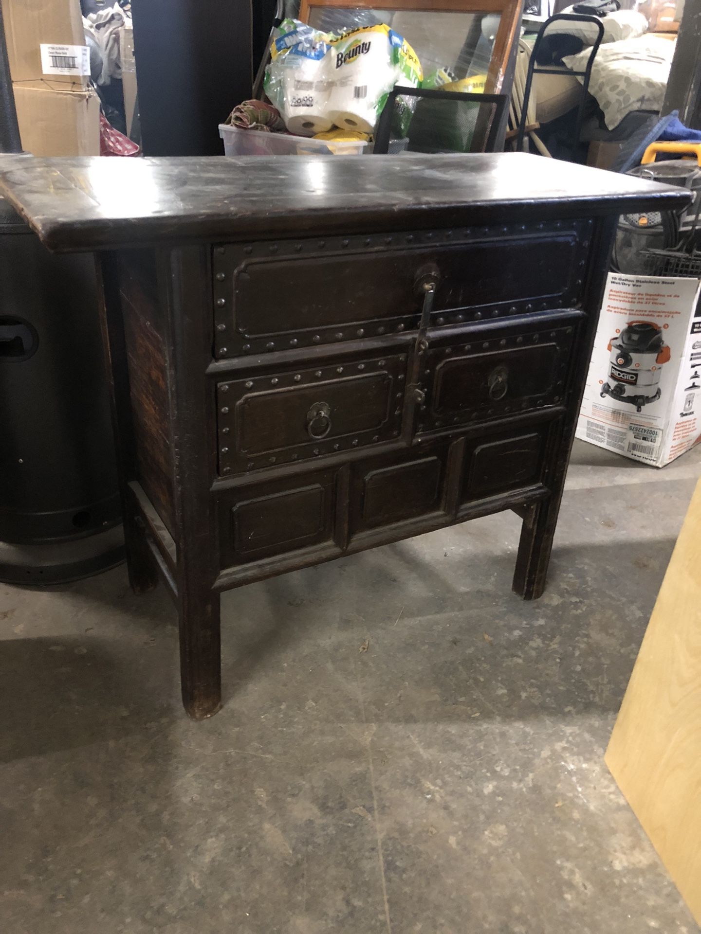 Antique Rustic Chinese console table, all hand made construction including hardware and doweling, solid Chinese elm wood, 3 drawers (1 over 2) top drawer locking metal strap, very sturdy, 43”L x18”S x 34”H