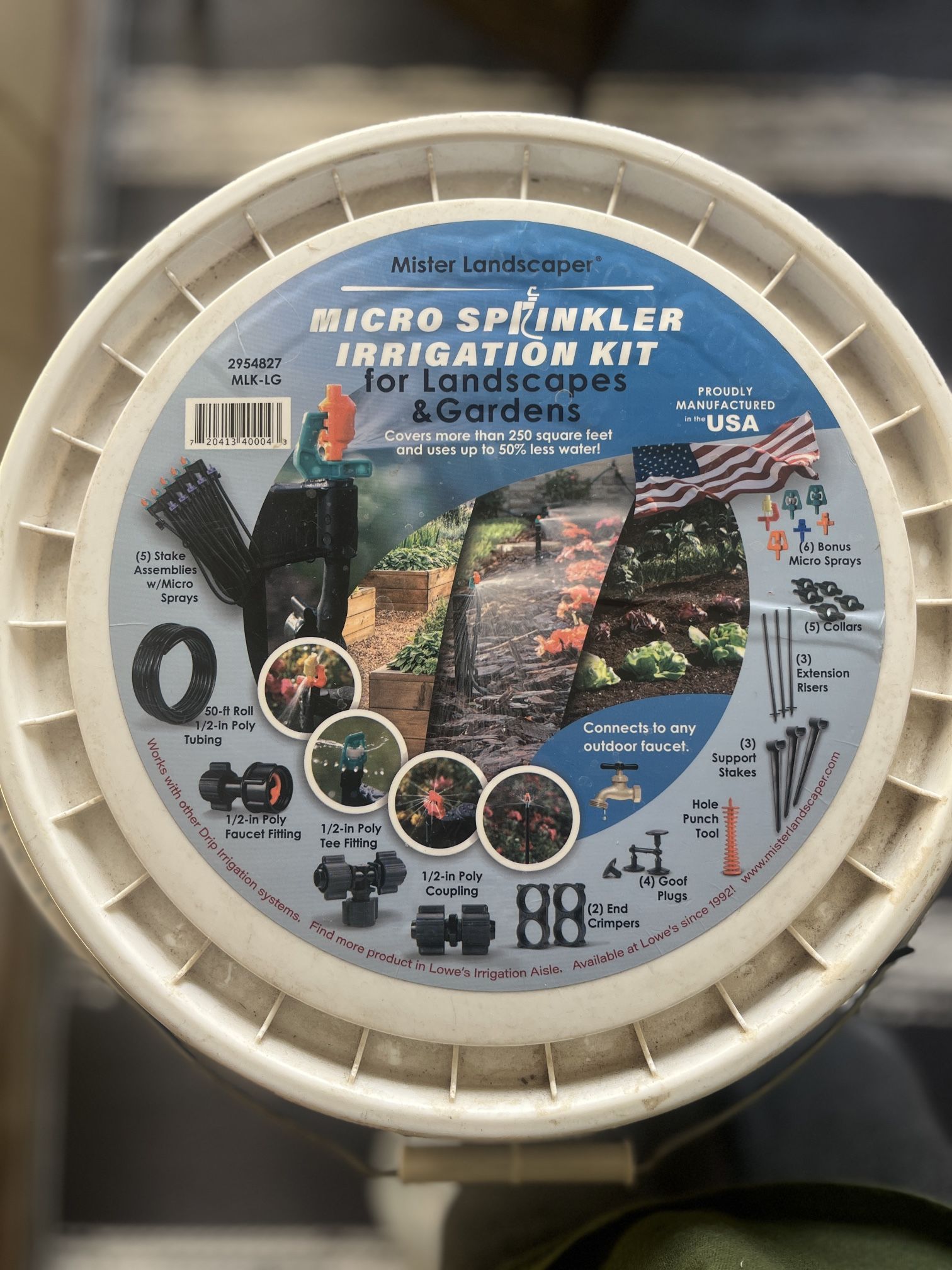 Price: $35.00 : For sale is a brand new, unused Mister Landscaper Micro Sprinkler Irrigation Kit (Model #MLK-LG). This is the complete "bucket kit" that retails for $75-$80 at Lowe’s. It is a great DIY system for raised garden beds, landscapes, or shrubbery. It connects directly to any standard outdoor faucet and is designed to use 50% less water than traditional watering. What’s included in the bucket: 50-ft Roll of 1/2-in Poly Tubing 5 Stake Assemblies with Micro Sprays 6 Bonus Micro Sprays (Total of 11 sprayers) 3 Extension Risers & 3 Support Stakes All necessary fittings: Faucet adapter, Tee fitting, Coupling, and End crimpers Hole punch tool and Goof plugs Installation manual