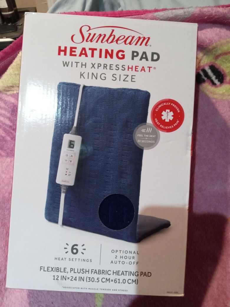 Sunbeam Heating pad with Express heat king size 6 heat settings flexible plush fabric heating pad 12" x 24"optional 2-hour Auto off brand new never used still in box