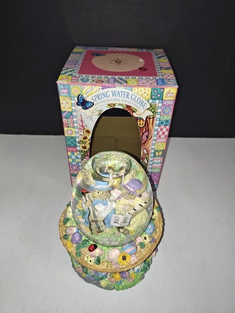 Easter Bunny Musical Easter Parade Spring Water Globe Egg Shaped Glass Dome. Packaging has some wear from age and storage. See pictures. Sold as is.