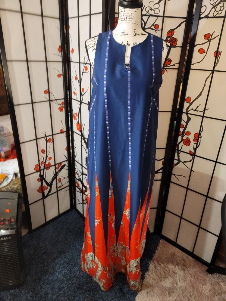 SIZE LARGE COTTON POLYESTER MARINE BLUE SYMBOLIC OF ELEGANCE/RED TRIAGULAR ART W/CHINESE DRAGONS OF POWER AND NOBILITY/ROUND NECK WITH CUT SLIT AT NECK/SOFT SHINY FABRIC/COLD WASH INSIDE OUT