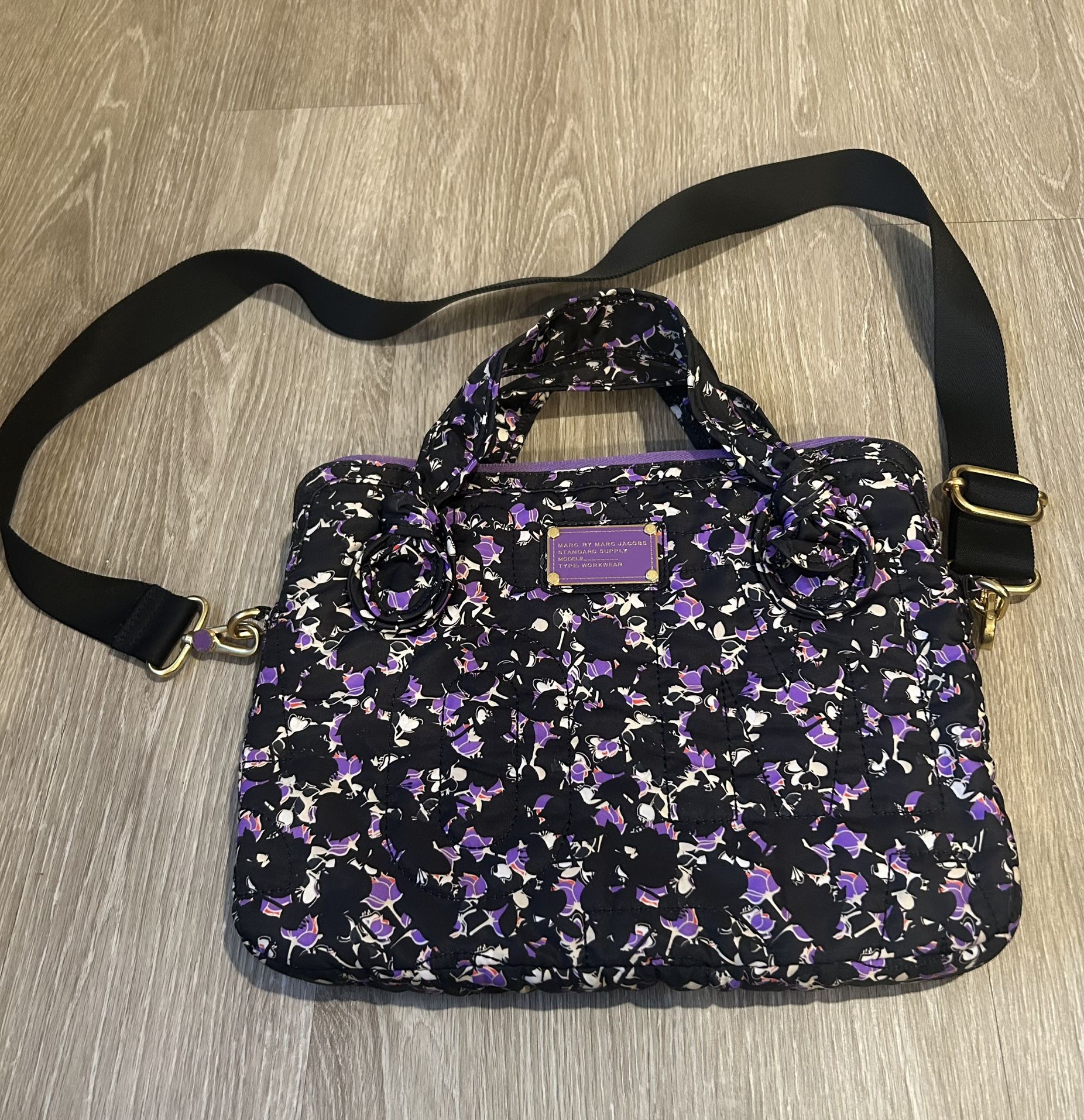 Marc Jacobs laptop carrier/case Beautiful, black and purple exterior with handles. Black strap is removable and adjustable. Gold clasps are embellished with Marc Jacobs seal. Clean plush black interior for protection. Small back pocket for additional storage. Fits most laptops. Fits my MacBook Pro and my HP.