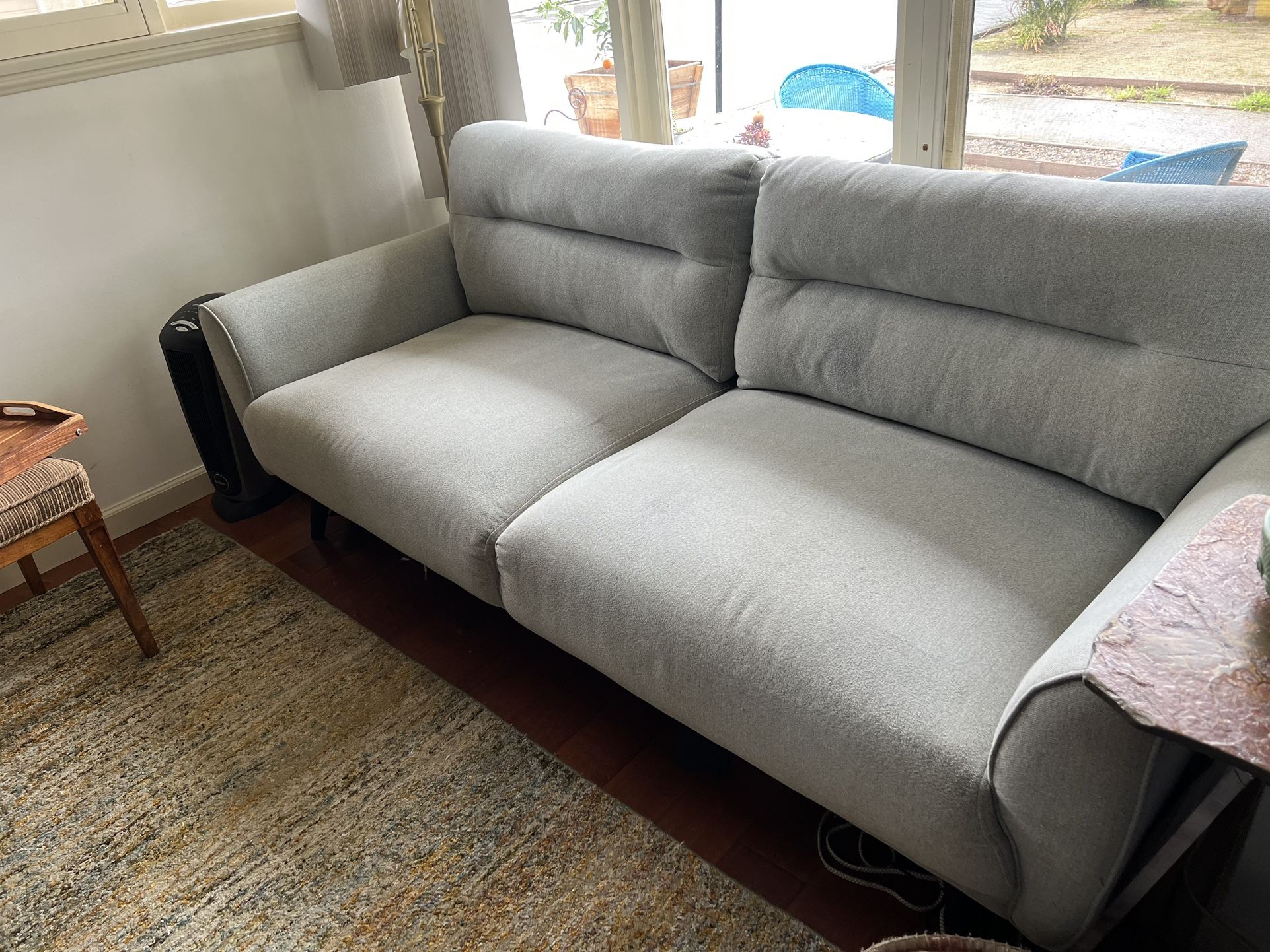 3 years old Out of stock but bought brand new and had delivered from Scandinavian Designs It’s called Regan Sofa It’s incredibly comfortable pillows come off and would be equal to a daybed/twin size Very well cared for and maintained. No rips or stains