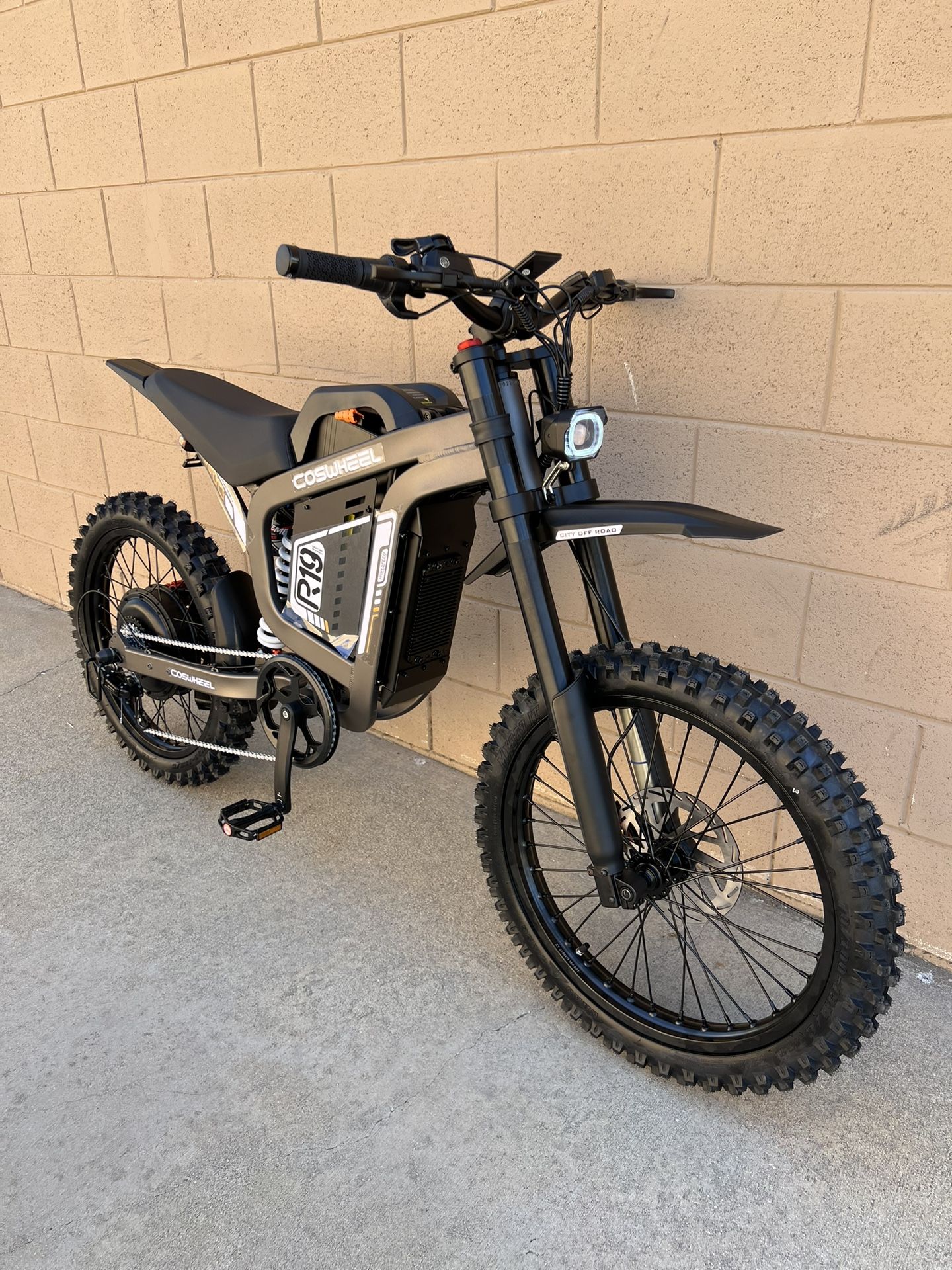 Coswheel R19 Electric Dirt Bike E-Bike 50 MPH ***** Financing Available ***** Fits person 5'1" - 6'5" Top Speed: Class 2/3, 50 Mph (80Km/h) Range: 75+miles (120km) in Class-2 throttle-only mode (pure electricity); 124miles (200km) in Class-1 PAS (pedal assist) Motor: 72V Peak 6000W (Rated 3000W) Brushless Rear Hub Motor 120Nm Battery: 72V 40Ah Lithium Battery Energy: 2880Wh Front Suspension: Inverted hydraulic shock absorber with adjustable damping, 200mm Travel Rear Suspension: Adjustable Damping, 300mm Travel Front Brakes: Double piston hydraulic oil brake, Equipped with 220mm*2.8 brake disc Rear Brakes: Double piston hydraulic oil brake, Equipped with 180mm*2.8 brake disc Front Tires: 70/100-19 professional off-road tire Rear Tires: 80/100-19 professional off-road tire Throttle: Grip Twist Throttle Charger: 84V6A Charger Charging Time: 6.0-7.0 Hours Display: 3.5" LCD high-brightness color screen Controller: 72V 80A Front Light: 12V Headlight Rear Light: LED Pedal Assist: 3 Levels Unlock Method: NFC Card Sensors: Speed Sensor Frame: Hydroformed Triple-Butted 6061-T6 Aluminium Alloy Pedal: Aluminum Alloy Pedal, with Reflect-light, Axis 9/16 x2 Crank: 1/2 "*3/32"*46T 7-speed ED Tooth Plate Rear Derailleur: Shimano 7-Speed Chain: 7-speed Anti-rust, 1/2" * 3/32" Handlebars: Split Handlebar, φ32 φ22 Sand Black Suitable Height: 5'1" - 6'5" Seat Height: 32.6" (83cm) Bike Height: 41.7" (106cm) Wheelbase: 47.8" (121.5cm) Handlebar Width: 27.2" (69cm) Bike Weight: ≥99lbs (with Battery) (≥45kg) Maximum Load: 440lbs (200kg) Safe Load: 330lbs (150kg) Overall Size: 74.8" * 27.6" *43" (190*70*109cm) Similar to surron light bee, surron lbs, Segway x160, Talaria, throne stony r-dirt ebike, tuttio e-bike