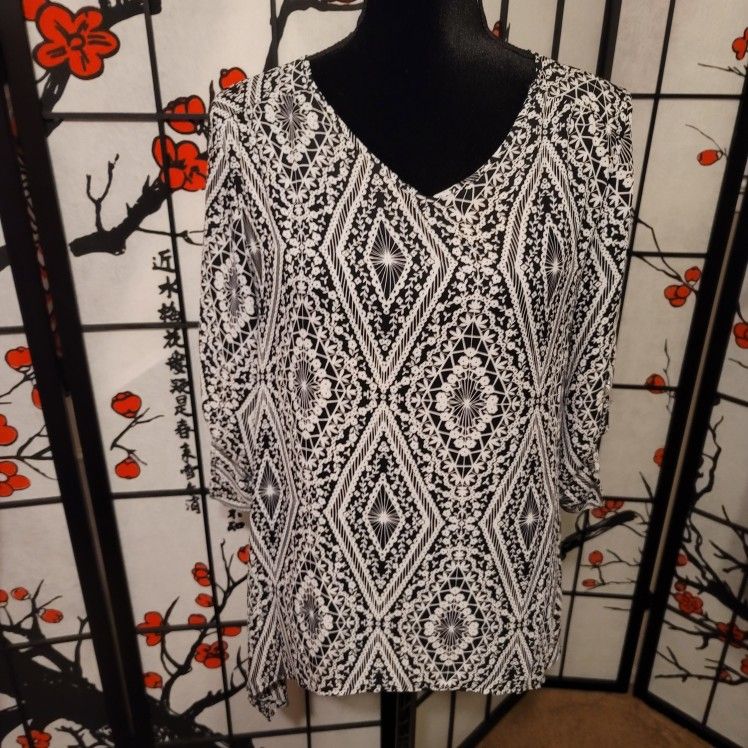 LADIES GEOMETRIC BLACK WHITE ASYMETRICAL TUNIC BLOUSE SIZE SMALL