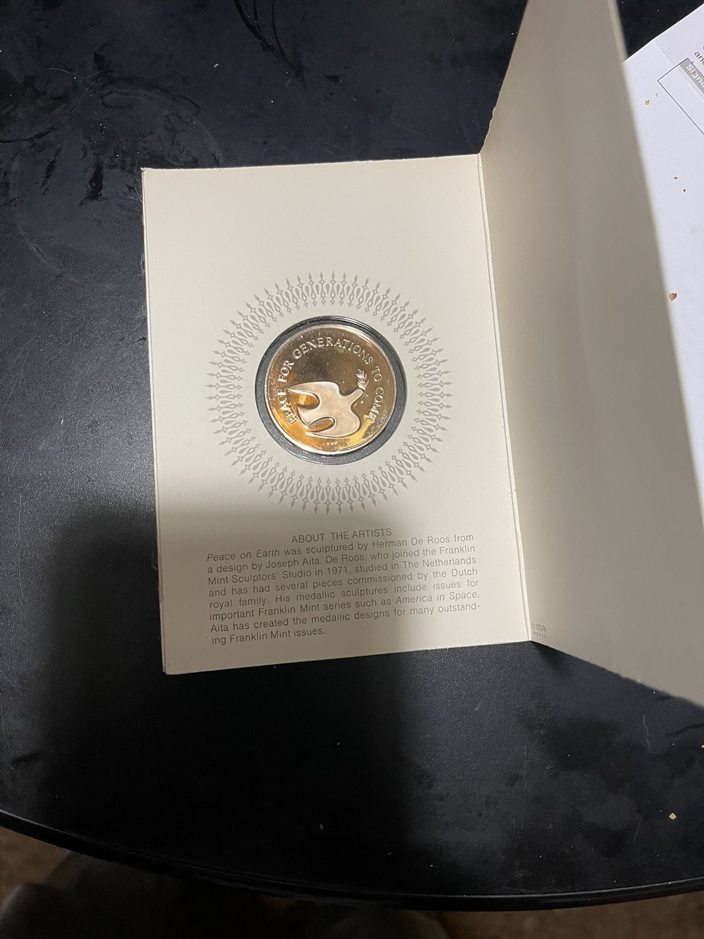 1973 Franklin Mint Medal Peace On Earth, Herman De Roos US Mint .