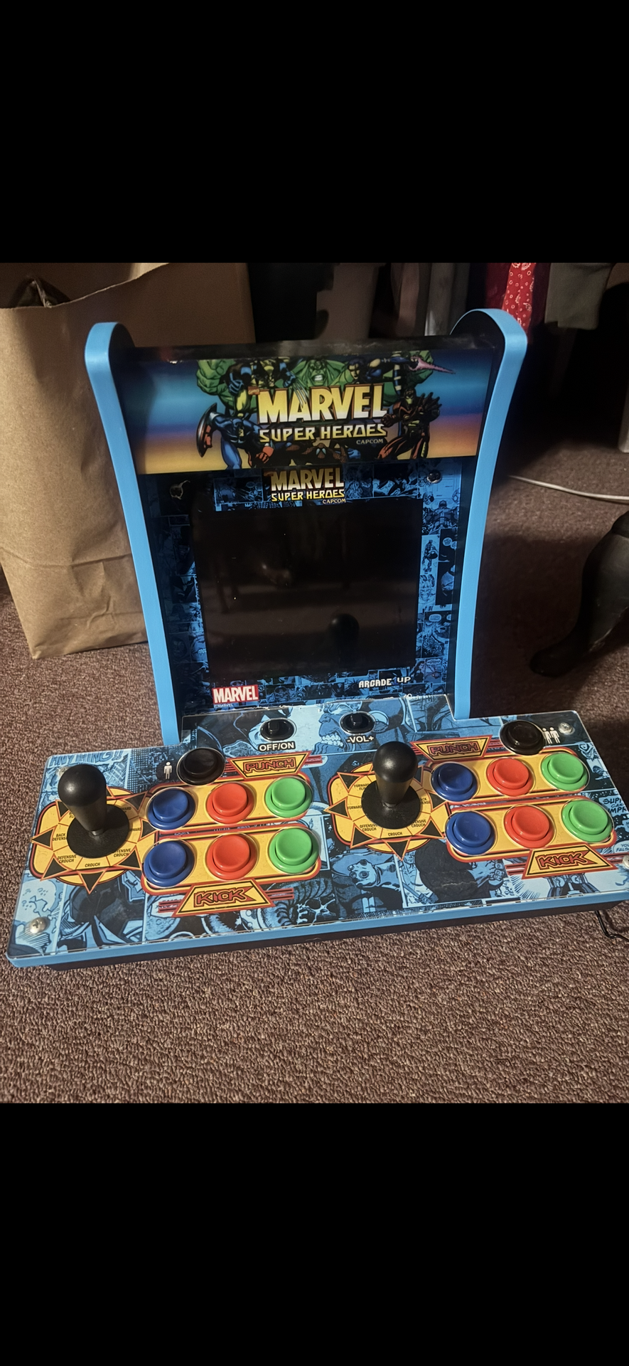 Selling our Marvel arcade game that’s in great condition comes with power cord. No box.