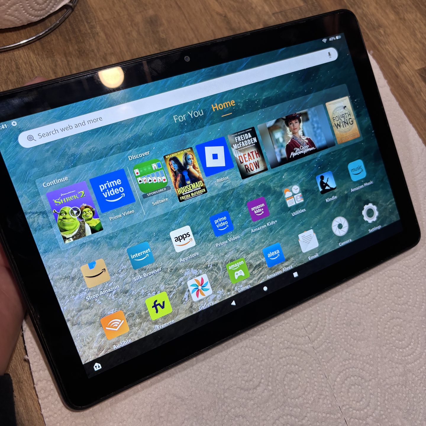 Can be used as a kids tablet!!! ๐ง๐ง๐ถ This Fire is the 10in screen version featuring a front facing camera and louder speakers! ๐ Links right up to your Amazon account! ๐ It comes with a 32gb sd card thatโs linked to the tablet via internal storage. The screen is clean and free of scratches and cracks! โจ More awesome stuff posted on my page! ๐ฅ๐ฅThanks for taking a look ๐