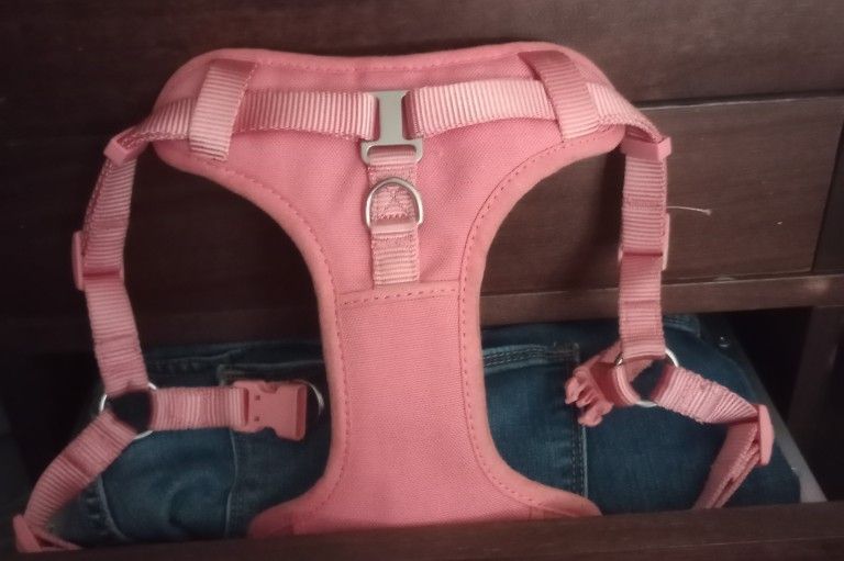 Medium sized step-in Dog Harness adjustable straps and comfort cushion padding throughout chest/body piece 😊 (Coral)Pink SIZE Medium-- excellent condition was gifted to me but too big for my pup. Smoke free home *SERIOUS INQUIRIES ONLY PLEASE*THANK YOU 😁