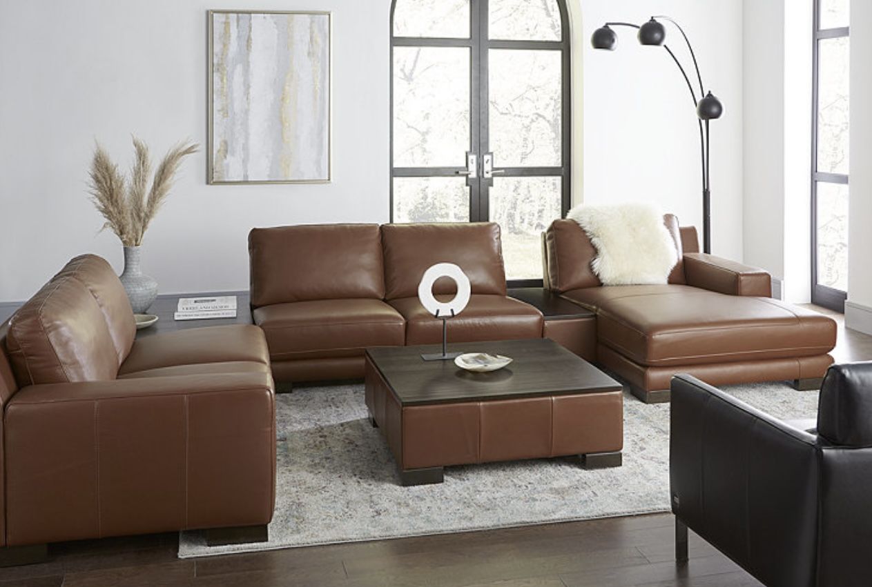 Resolute style and a sumptuous feel can take your living space to the next level with this exclusive five-piece sectional. Simple track arms and oversized stitch-defined cushions lend this handsome collection a clean and modern look that walks the line between imposing and cozy. Incorporated wood-topped accent tables provide not only a seat-side convenience but maintain a continuous flow of style in your living space. Not to be forgotten is the incredible comfort offered by smooth leather that is soft in hand over dense foam, creating a luxurious feel that will endure