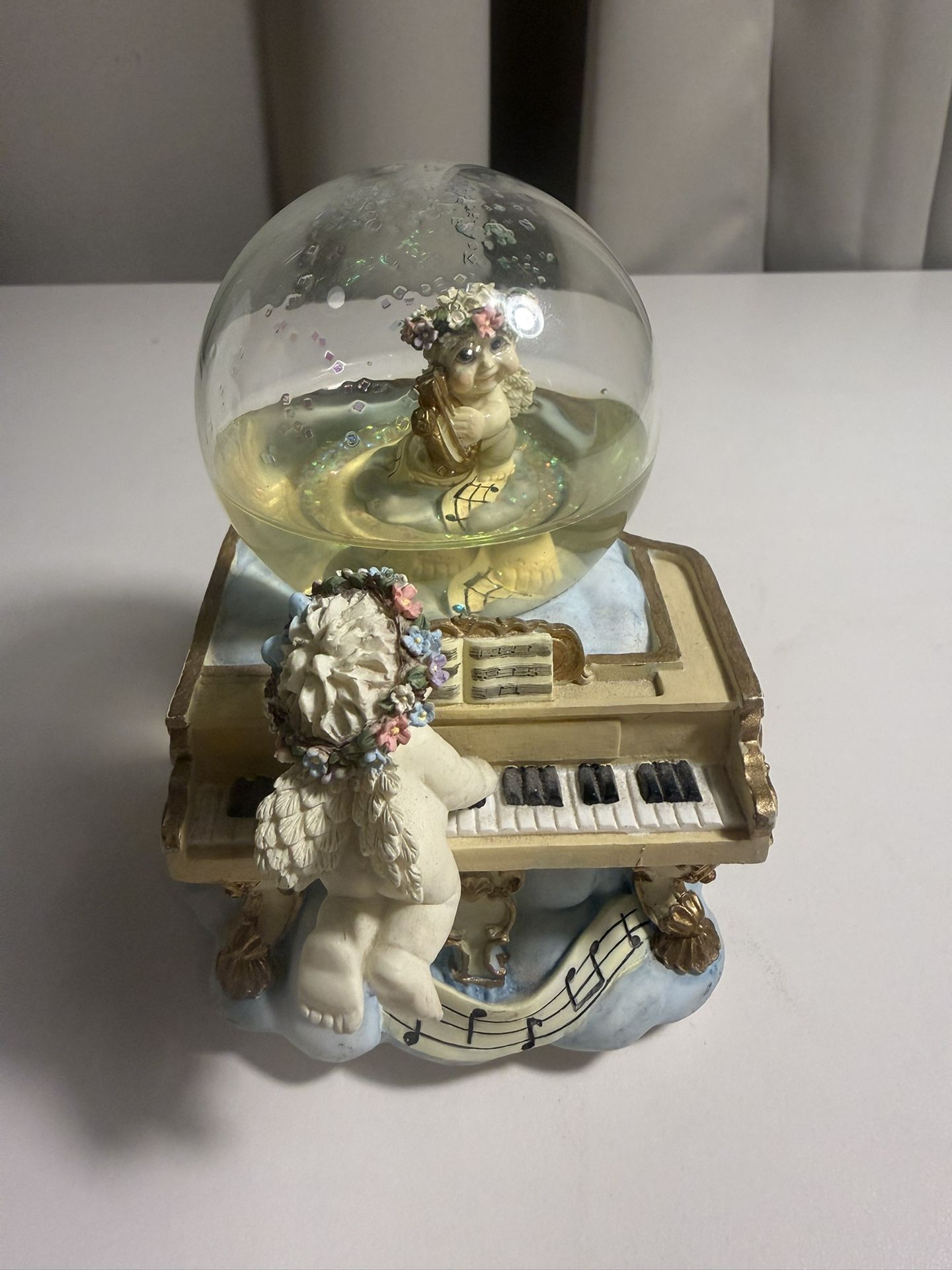 Beautiful angel cherub snow globe featuring a detailed piano base with musical notes and ornate gold trim. • Musical and working • Water globe with glitter • Cherub angel figures • Decorative cloud base • Excellent display piece Perfect for collectors, music lovers, or vintage-inspired home decor.