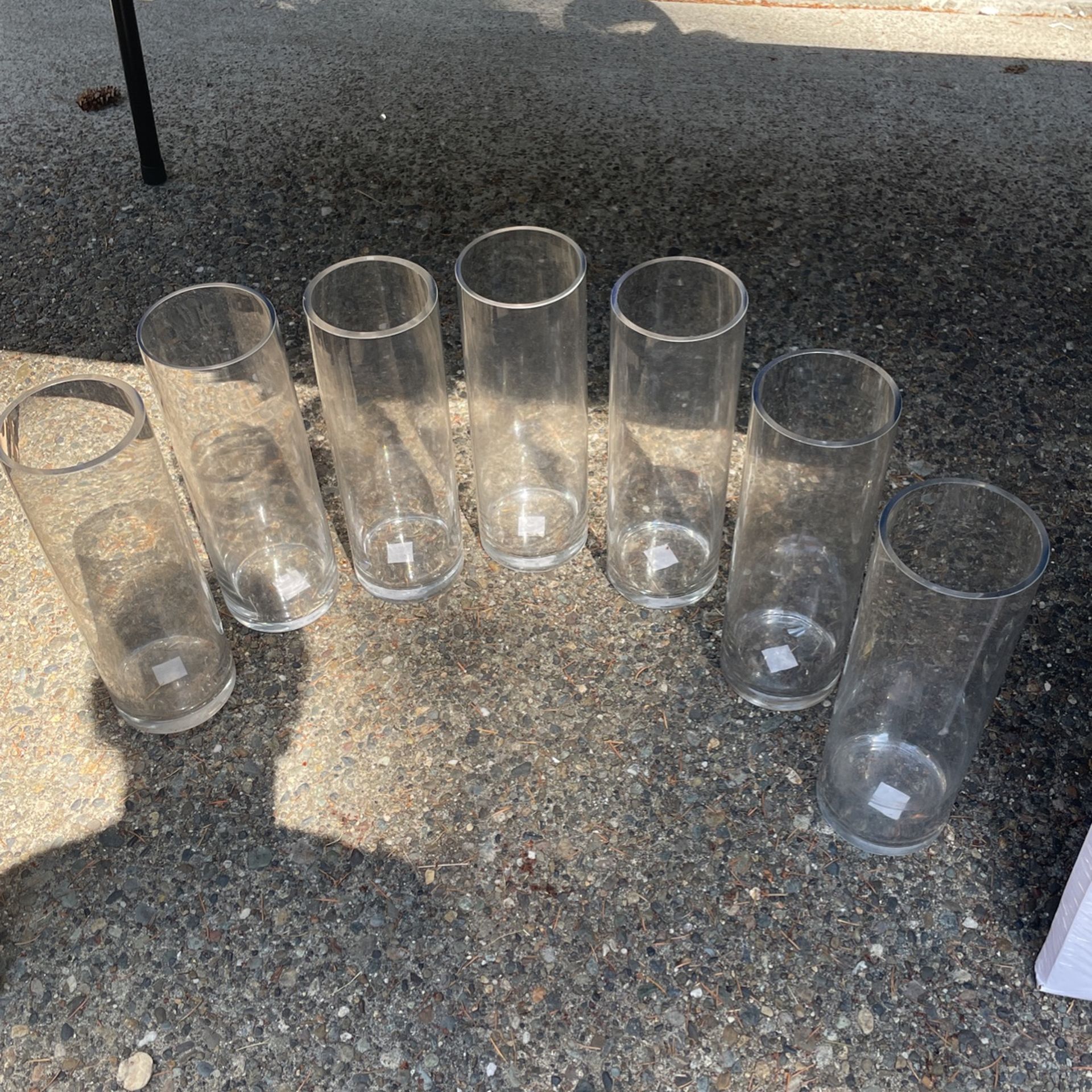 7 large glass vases used for wedding. Can be used for flowers or candles.
