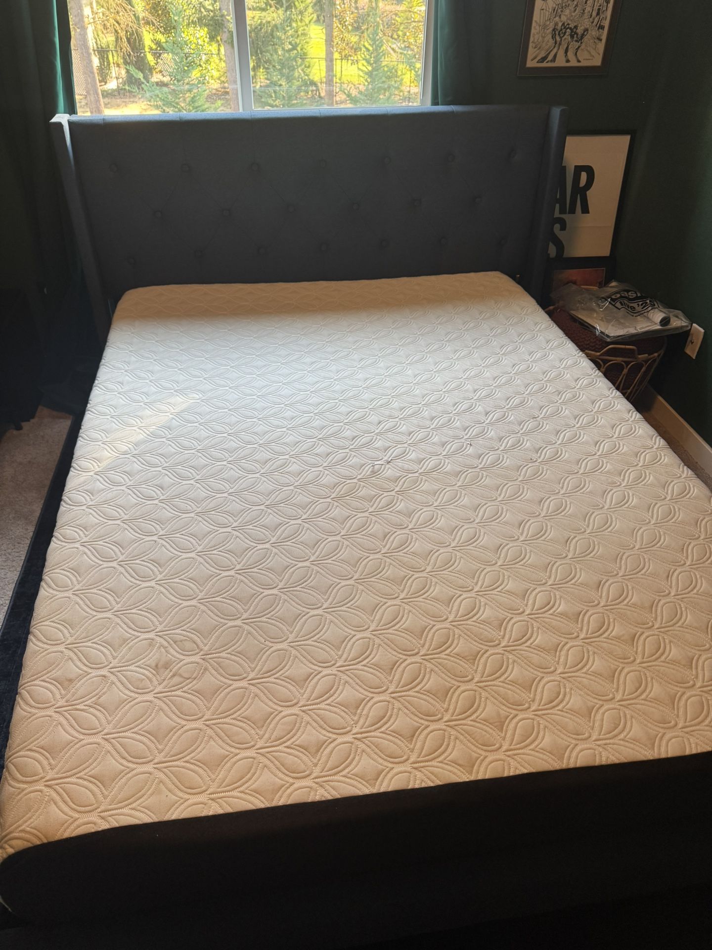4 year old Queen size mattress and bedframe for sale. Mattress is a cocoon by Seely chill mattress and the blue tufted bedframe is by wayfair. The base is a slatted.