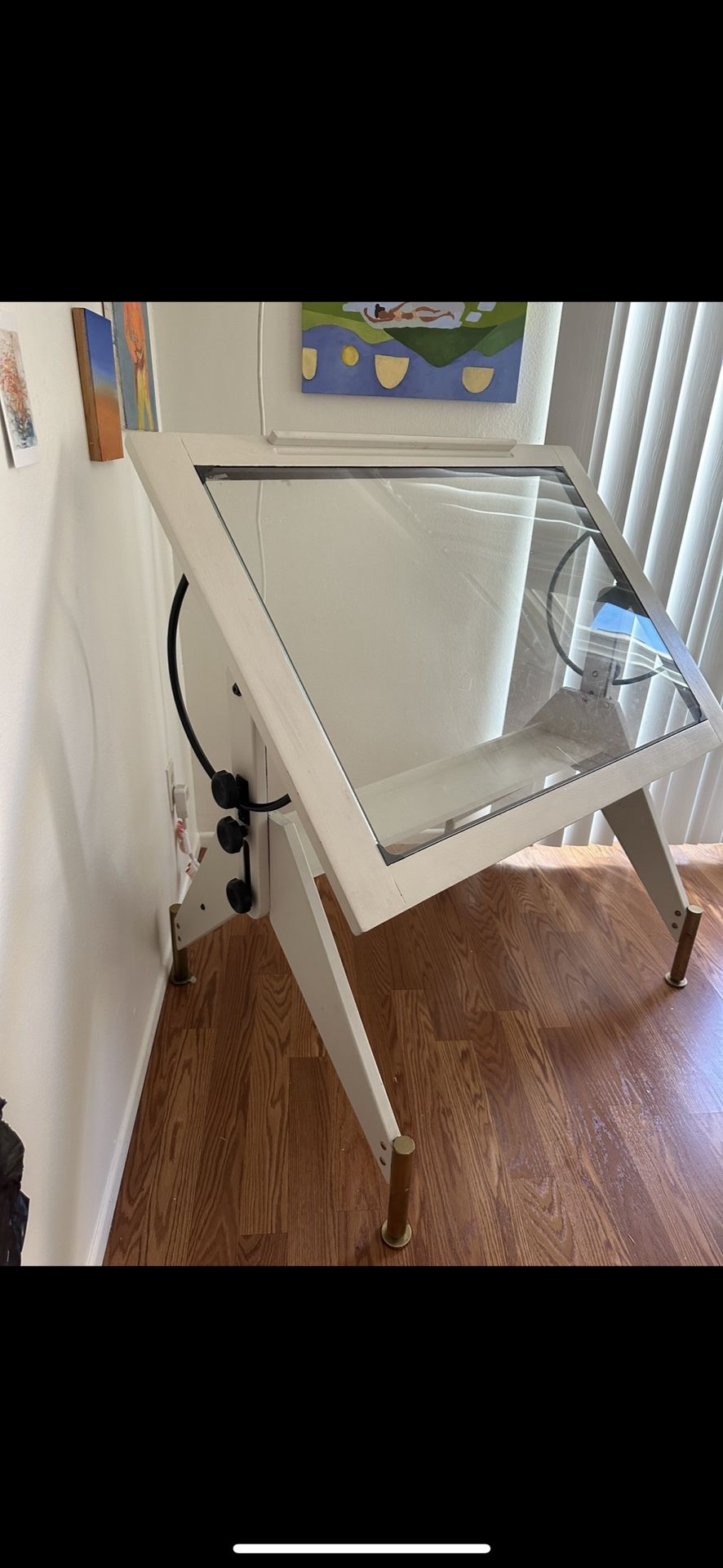 Glass Inlay, has been used as a work table for drafting- has few signs of wear on the bottom legs/top, but easy to fix! Adjustable drafting table made of wood and painted white! Dimensions: 42”x30”x36”h adjustable