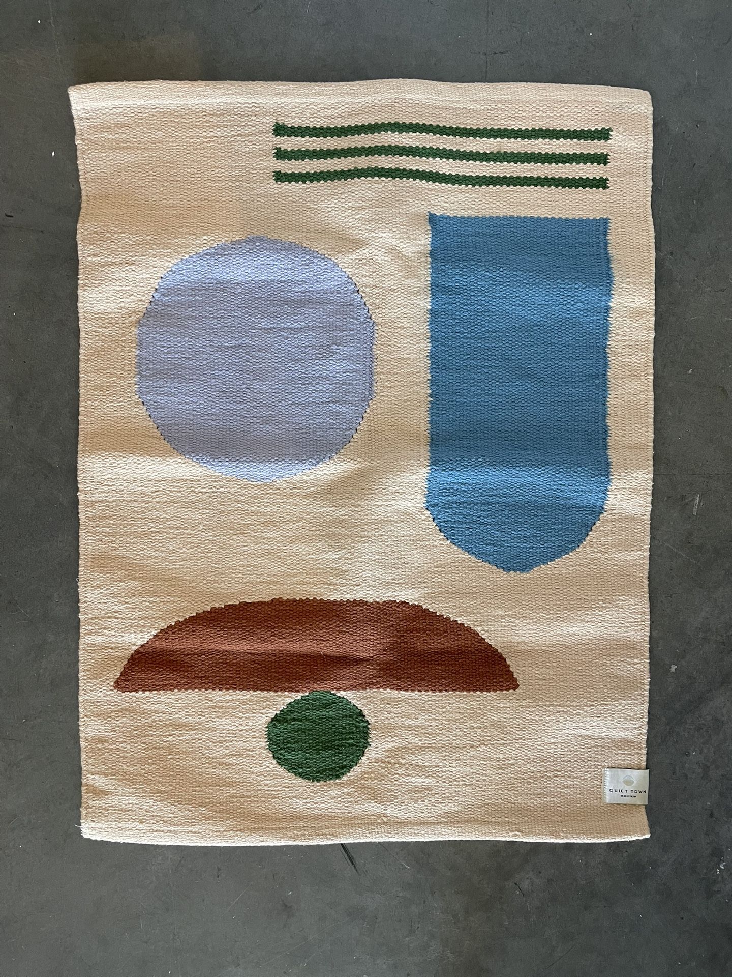 This cotton Killam rug is handwoven in India in a pattern inspired by the 1970s "future-city" called Arcosanti in Arizona. 31" x 42" 100% cotton Global Organic Textile Standard (GOTS)-certified Gently, barely used and cleaned