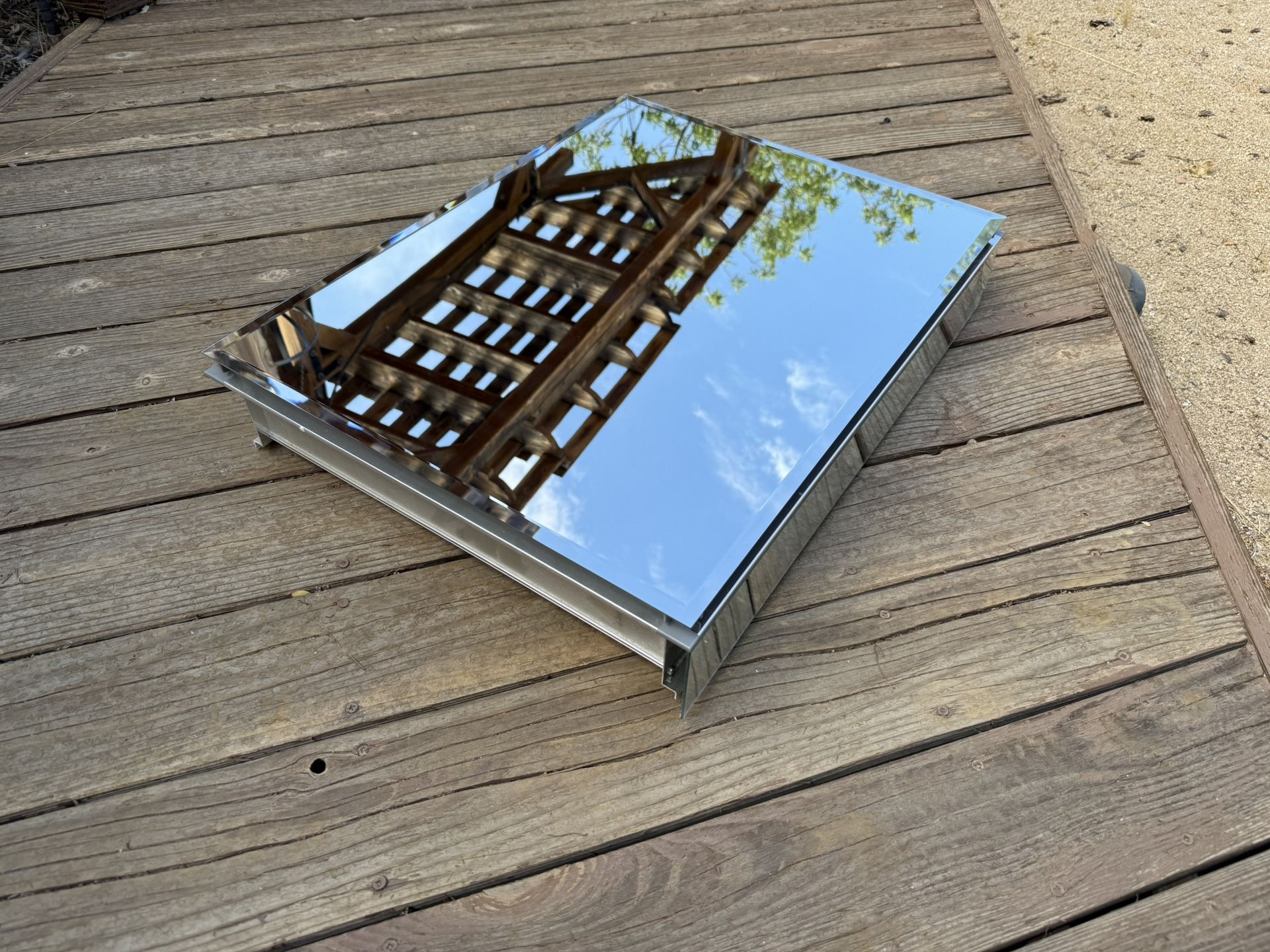 This is a used unit from a recent renovation. There is a mirror on one side that is broken and easily replaced. We also have 3 others, this is the only one with a mirrored edge. Shelves and hardware used in previous installation included. This mirrored cabinet features a 1/2" beveled frameless door that can be installed with a left or right hinge. Inside, two adjustable 1/4" glass shelves hold all your toiletries and bath items in front of a beautifully mirrored rear wall. Rust-free aluminum construction ensures years of use, and installation has never been easier with the included side kit, allowing for either recess or surface-mount installations. Features: • Constructed from High Quality, Anodized Aluminum with a Durable Rust-Free, Chip-Free Finish • Features Full-Overlay, Dual-Sided Mirror Door with Beveled Edges • Includes Mirrored Interior Rear Wall with Two Adjustable 1/4 Inch Thick Glass Shelves • Reversible Hinges with 108 Degree Opening Capability Allows Door to Open on Either Left or Right Side • Mirrored Side Kit Allows for Either Surface or Recess Mount Installation Specifications: • Height: 26" • Width: 20" • Depth: 4-13/16" • Wall Opening Height: 25-1/8" • Wall Opening Width: 19" • Wall Opening Depth: 3-5/8"